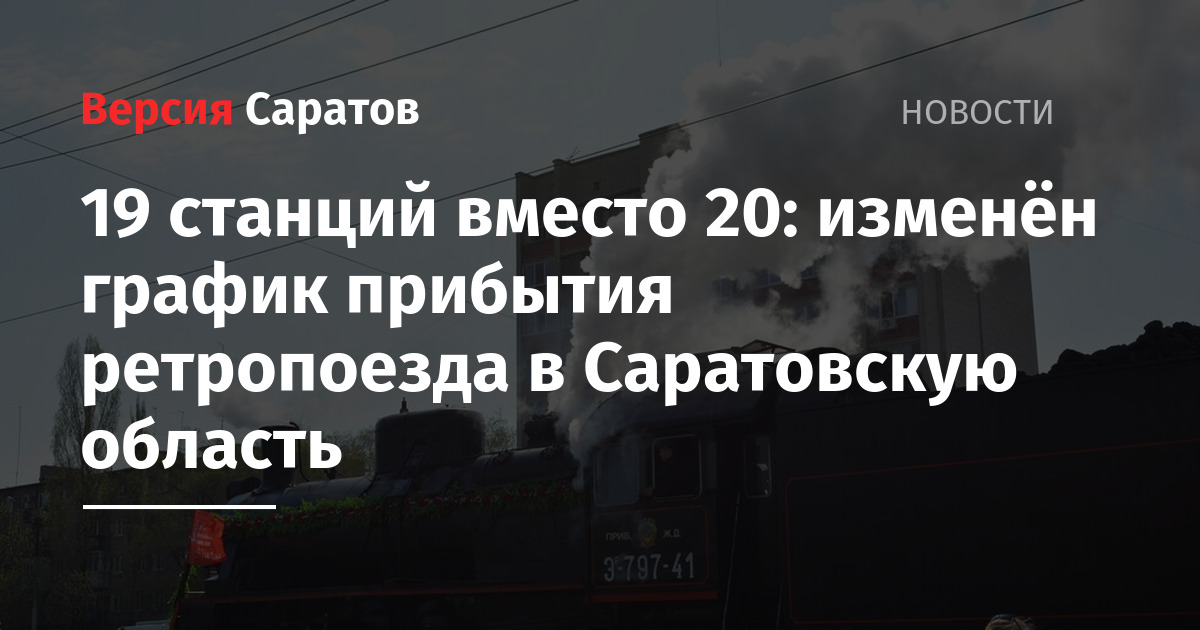 По техническим причинам график работы ретропоезда «Воинский эшелон» скорректирован. Он посетит 19 железнодорожных станций в Саратовской области (вместо 20) и одну — в Волгоградской. Об этом сообщили в ПривЖД.