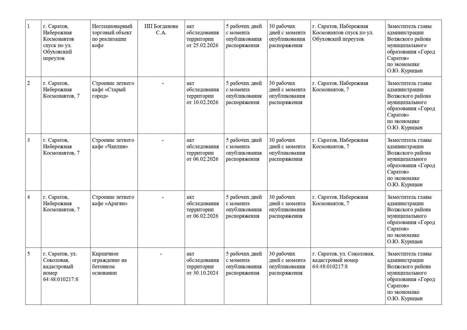 Также демонтажу подлежат ларек с кофе на спуске к Набережной Космонавтов, принадлежащий ИП Богдановой С. А. и кирпичное ограждение на бетонном основании на улице Соколовая (кадастровый номер 64:48:010217:8).