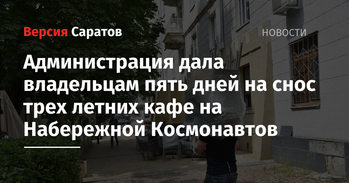 Волжская администрация требует снести летние кафе у дома № 7 по Набережной Космонавтов, которые принадлежат ресторанам «Старый город», «Чаплин» и «Арагви». Нарушения были выявлены при обследовании в январе. При этом владельцев этих строений чиновники не нашли.