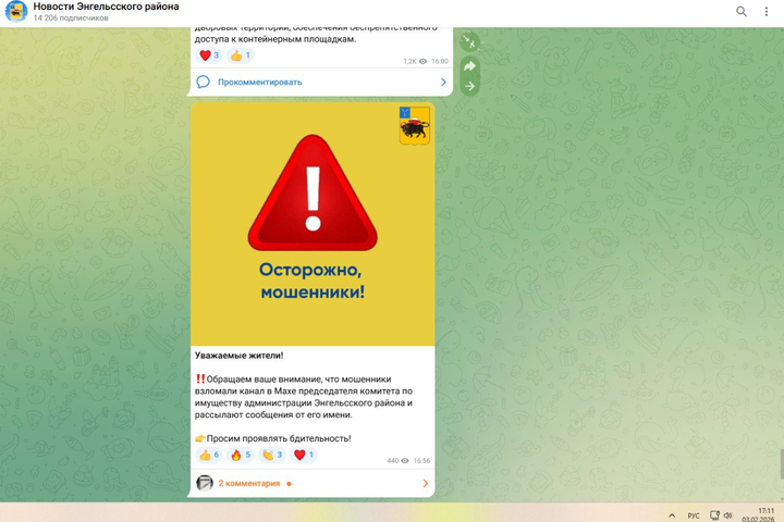 «Уважаемые жители! Обращаем внимание, что мошенники взломали канал в Махе председателя комитета по имуществу администрации Энгельсского района и рассылают сообщения от его имени. Просим проявлять бдительность!» — говорится в официальном сообщении.