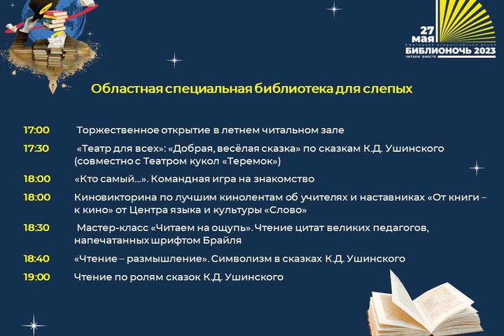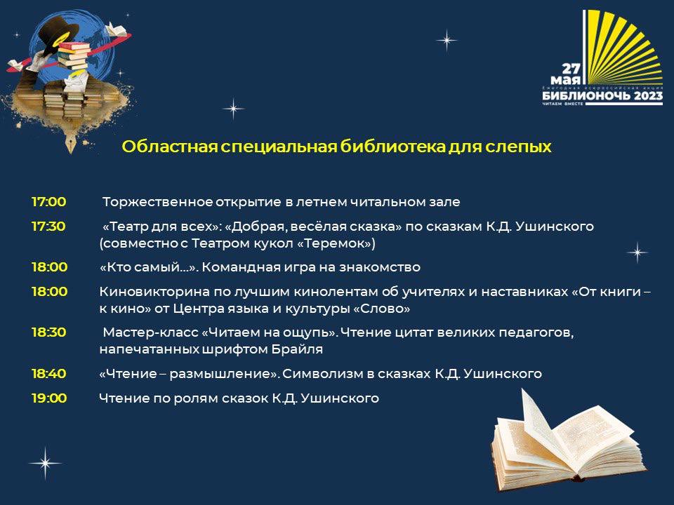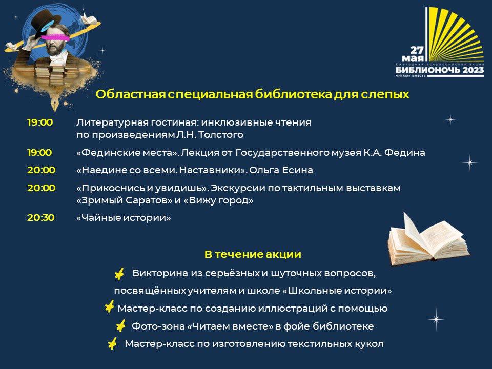 В рамках акции запланировано свыше 1500 событий, которые пройдут на площадках более 300 библиотек. С 16:00 до 22:00 посетителей будут ждать мастер-классы, открытые микрофоны, литературные обзоры, спектакли, выставки, игры, викторины, литературные чтения, экскурсии, творческие встречи. Площадками мероприятия в областном центре станут модельные библиотеки, центральная городская библиотека, библиотека № 10, а также областные библиотека для детей и юношества имени Пушкина, специальная библиотека для слепых и универсальная научная библиотека.
