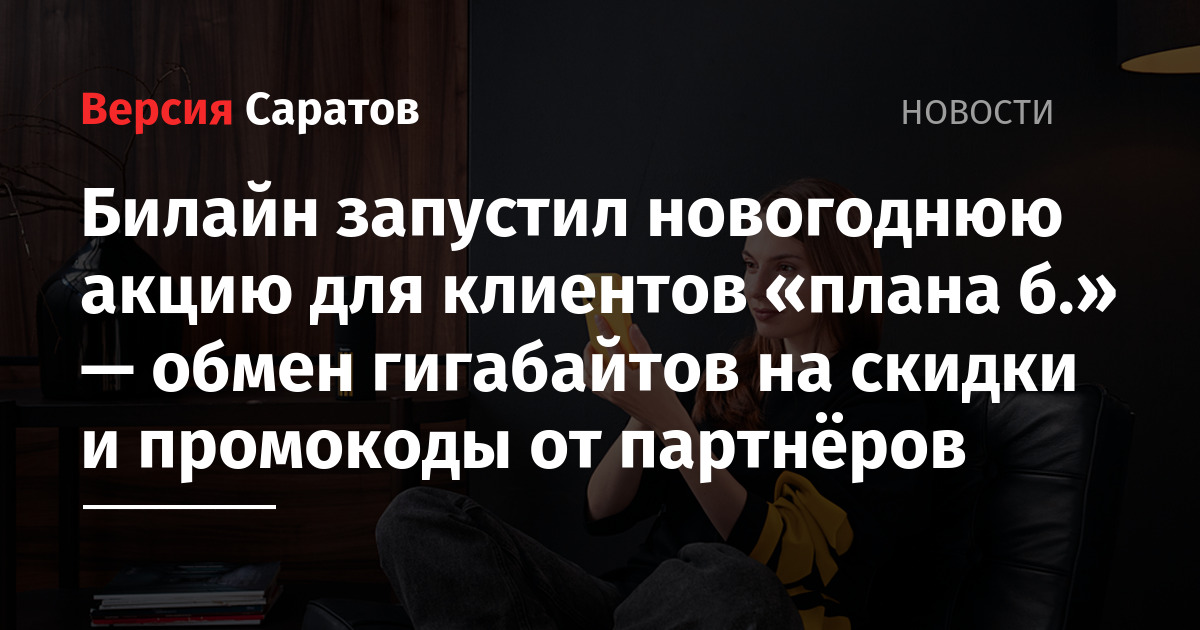 * Акция действует с 26.11.2025 до 15.01.2026 и доступна только в мини-приложениях (12+) «плана б.» в Telegram, MAX и во «ВКонтакте». Условия действия скидок и промокодов определяют партнёры. Организатор Акции — ПАО «ВымпелКом» (РФ, 127083, Москва, ул. 8 Марта, д. 10, стр. 14, ОГРН 1027700166636). Организатор вправе в любой момент изменять условия (в т. ч. ценовые) и сроки проведения Акции. Информация об изменениях и Правила Акции публикуются на сайте beeline.ru.