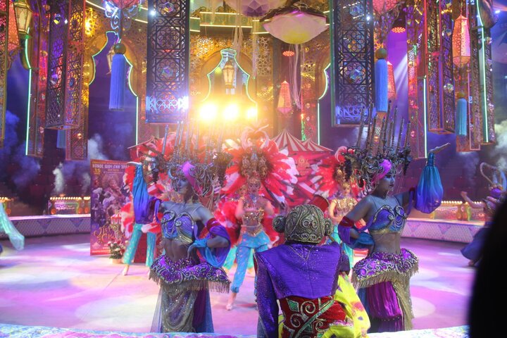 На 10 минут манеж Саратовского цирка превратился в таинственный ближневосточный замок. Сочетание музыки и художественного светового оформления позволило гостям полностью погрузиться в атмосферу экзотической сказки. Сначала по арене прошагали верблюды с прекрасными наездницами. Затем выступили воздушные гимнасты, акробаты, канатоходцы, жонглеры и артисты балета. Невероятно красивые костюмы артистов приковывали взгляд всех присутствующий.
