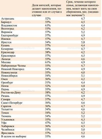 Самая большая доля семей, делающих сбережения, приходится на Владивосток, Москву, Краснодар, Ростов-на-Дону и Казань. Наименьшая доля семей, откладывающих накопления, отмечена в Уфе, Оренбурге, Пензе, Астрахани и Волгограде.