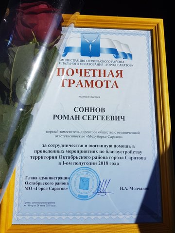 Вчера состоялось расширенное заседание постоянно действующего совещания при главе администрации Октябрьского района Саратова. За сотрудничество и оказанную помощь в проведенных мероприятиях по благоустройству территорий района компания «Мехуборка-Саратов», в лице первого заместителя директора Романа Соннова, была отмечена почетной грамотой администрации Октябрьского района.