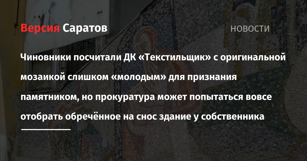 «Комитет культурного наследия Саратовской области 25 декабря вынес приговор мозаике, расположенной на стенах бывшего ДК „Текстильщик“. Ей не хватило каких-то несчастных 6 лет…», — подчеркнула Екатерина Адонина, которая активно борется за сохранение мозаики.