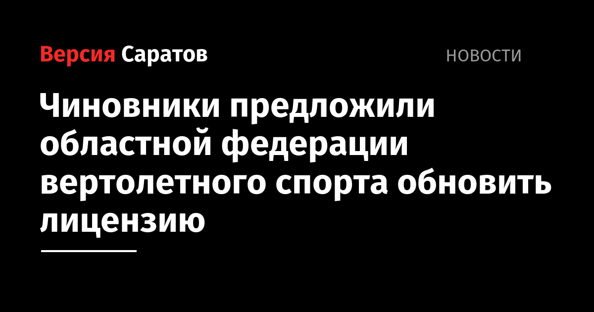 Согласно общему реестру зарегистрированных на территории Саратовской области организаций, занимающихся развитием спортивных дисциплин, у регионального отделения общероссийской общественной организации «Федерация вертолетного спорта России» Саратовской области действие аккредитации завершается 1 августа. Прежняя лицензия, дающая права на организацию, проведение соревнований, формирование сборных, а также возможность финансирования из областного бюджета, была выдана в 2016 году на основе приказа экс-первого заместителя министра Андрея Козлова.