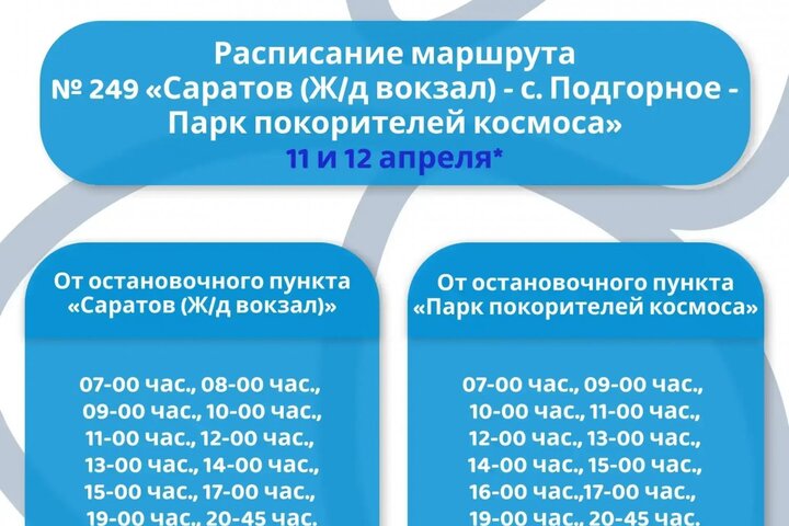 По информации министерства, 11 и 12 апреля будут введены 18 дополнительных рейсов по маршруту № 249 «Саратов (железнодорожный вокзал) — село Подгорное — Парк Покорителей космоса». Решение, как сообщили чиновники, принято в связи с проведением мероприятий, приуроченных ко Дню космонавтики.
