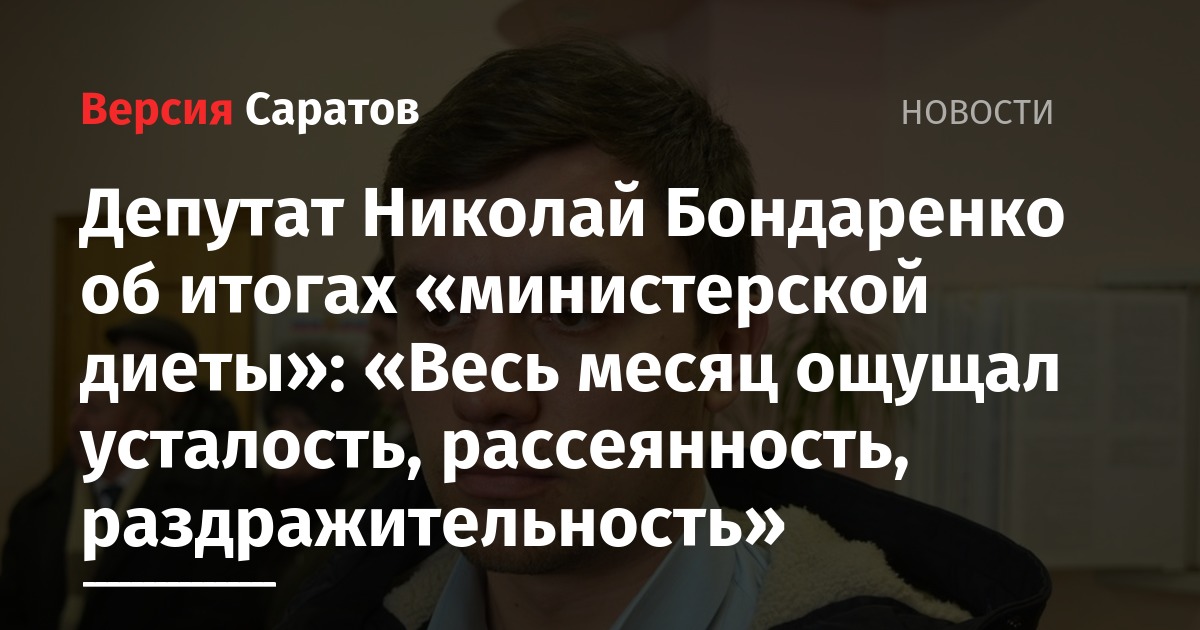 Напомним, депутат сел на диету после дискуссии с министром занятости, труда и миграции Саратовской области Натальей Соколовой. Бондаренко утверждал, что невозможно нормально питаться и тратить на продукты лишь 3,5 тысячи рублей в месяц. Глава ведомства отмечала, что суммы в 3,5 тысячи рублей достаточно «для удовлетворения минимальных физиологических потребностей». Наталья Соколова вскоре после перепалки с Бондаренко была уволена с поста министра, а Николай Бондаренко начал ограничивать себя в еде.