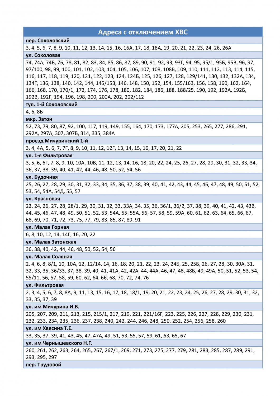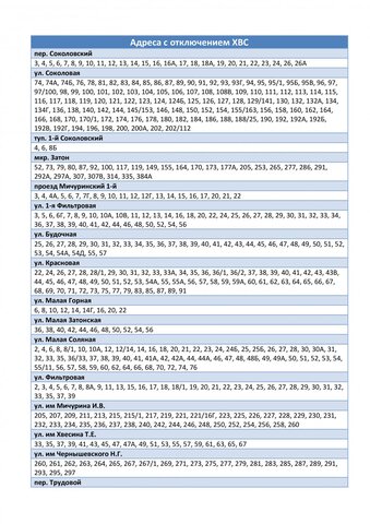 Воды не будет завтра, 14 ноября, с 1:00 до полуночи. С адресами, которые попадут под отключение, можно ознакомиться в прикреплённых ниже картинках.