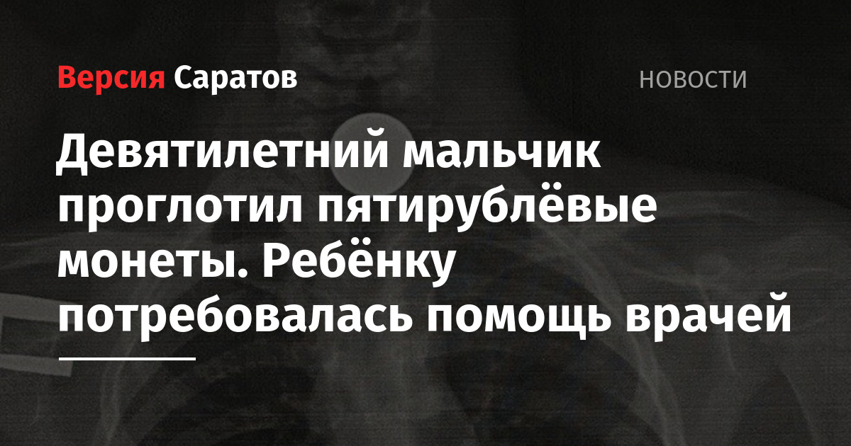 По словам врачей, вчера вечером, 30 июля, в стационар медучреждения «скорая» привезла из Пугачева девятилетнего мальчика. «По словам ребёнка, он случайно проглотил пятирублёвую монету. Это подтвердил рентгеновский снимок», — говорится в сообщении в Telegram-канале больницы. В итоге оказалось, что монеты две.