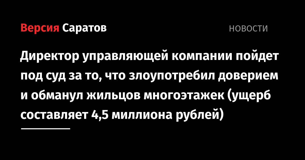 В Ленинском районе Саратова завершено расследование уголовного дела, возбужденного в отношении директора местной управляющей компании. Его обвиняют в причинении имущественного ущерба путем обмана или злоупотребления доверием, совершенном в особо крупном размере.