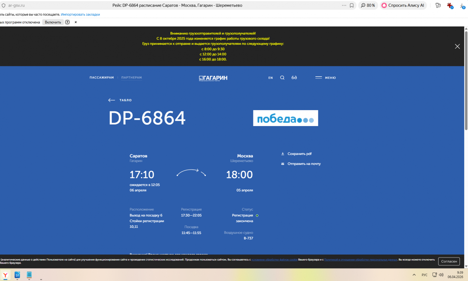 Так, вылет самолёта в Москву сдвинули с 17:10 вчерашнего дня, 5 апреля, на 12:05 сегодняшнего. Самолёт из Сочи должен был прилететь вчера в 16:40, однако теперь его ожидают в 11:35 сегодняшнего дня. Отметим, что на Краснодарский край этой ночью была атака БПЛА.