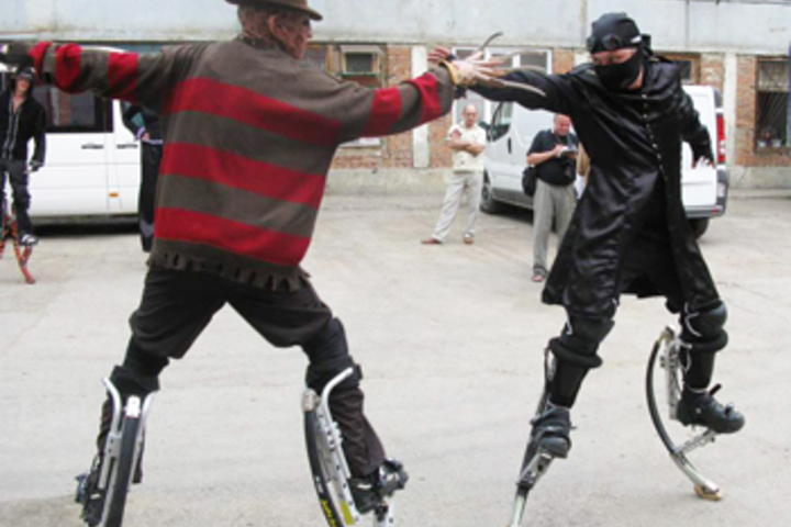На площадке перед входом в здание мастерство в исполнении прыжка-шпагата демонстрировали джамперы из команды "Земля-Воздух". Среди одетых в черное прыгунов выделялась пара Фредди Крюгер - девочка в белом платье. Фотографы то и дело просили Фредди приставить пальцы-ножи к горлу жертве, а девочке при этом перестать смеяться.