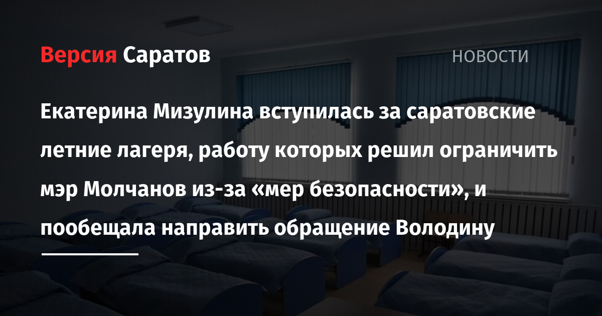 Екатерина Мизулина вступилась за саратовские летние лагеря, работу которых решил ограничить мэр Молчанов из-за «мер безопасности», и пообещала направить обращение Володину