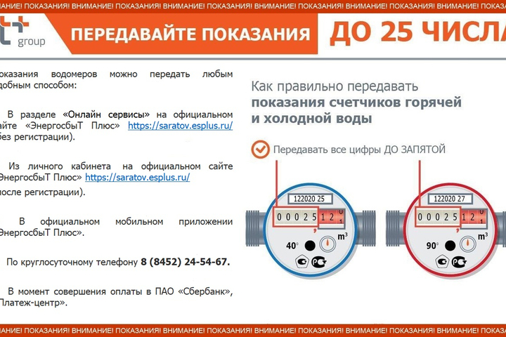 ссылке или позвонив по круглосуточному телефону 8 (8452) 24-54-67. Регистрация не требуется. Доступны сервисы ПАО «Сбербанк», «Платеж-центр». Своевременная передача показаний приборов учета позволит избежать выставления квитанций по нормативу.