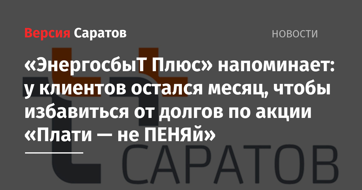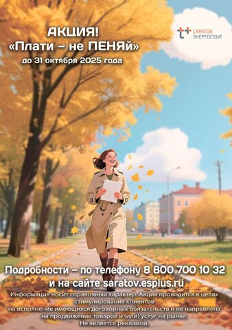 Саратовский филиал «ЭнергосбыТ Плюс» напоминает жителям региона: до 31 октября 2025 года можно воспользоваться условиями акции «Плати — не ПЕНЯй» и списать пени.
