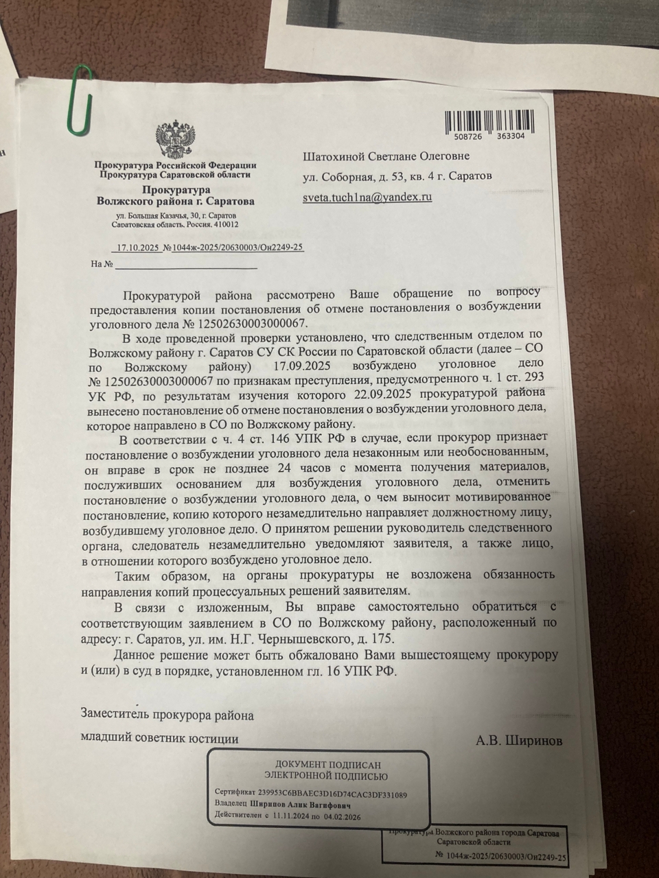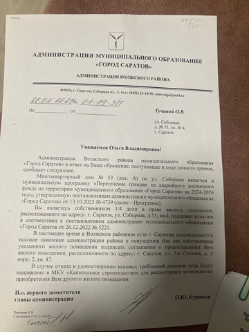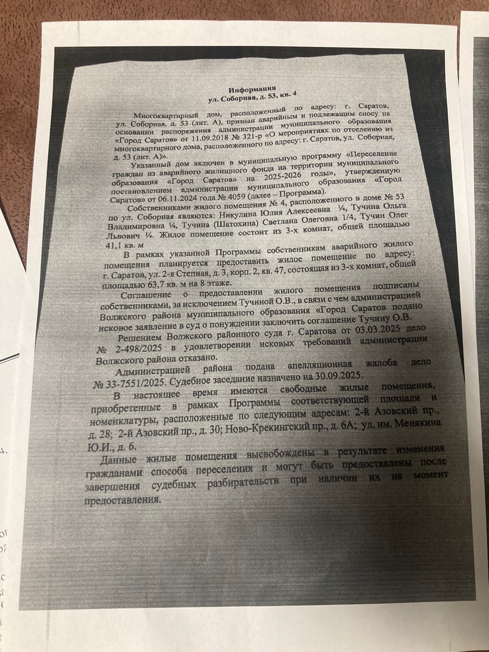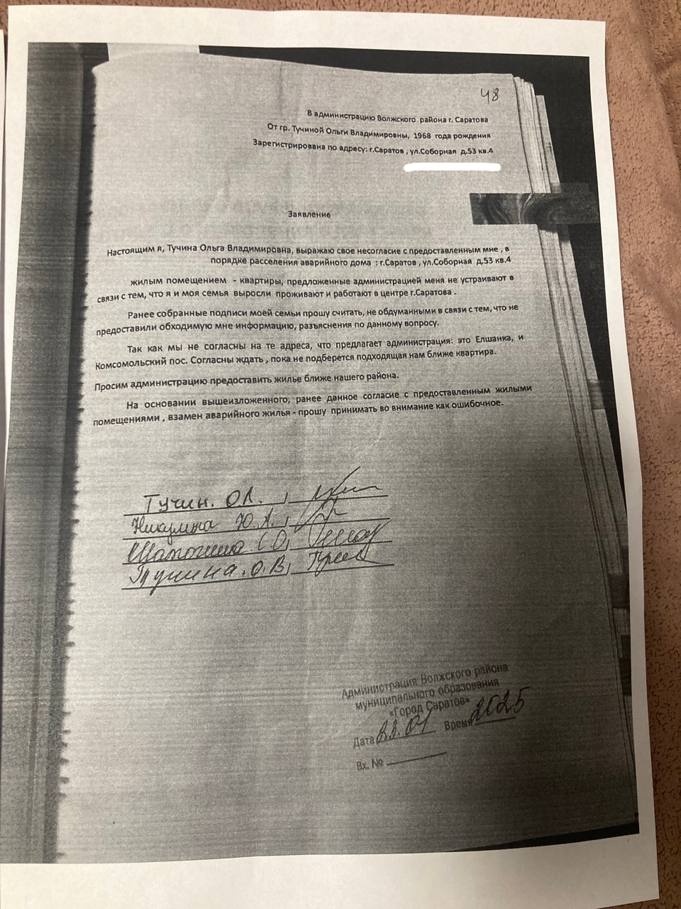 «Мы обратились к Бастрыкину. Он почти сразу взял это на контроль и поручил саратовским следователям провести проверку. В итоге в отношении чиновников завели уголовное дело. В этот момент появилась информация от МКУ «Капитальное строительство», что есть свободная квартира для переселенцев в Юбилейном — на Менякина, 6.