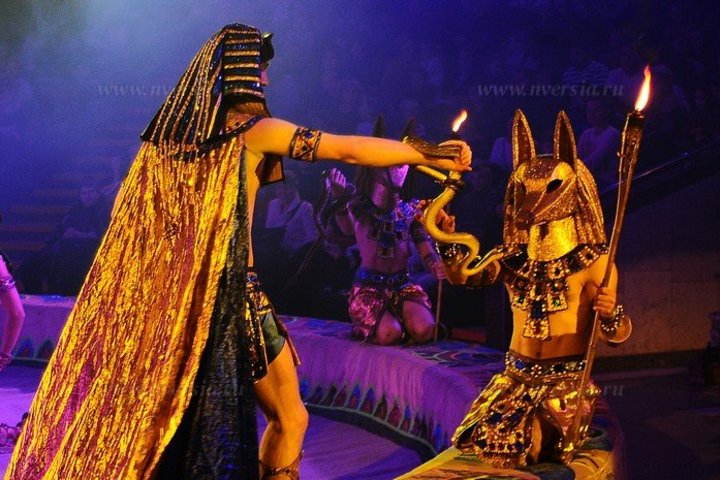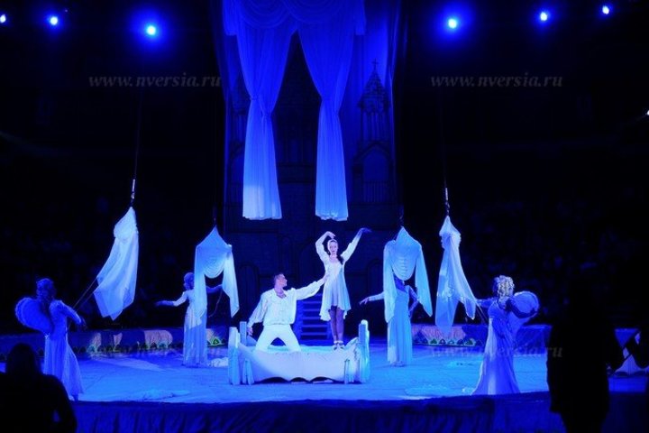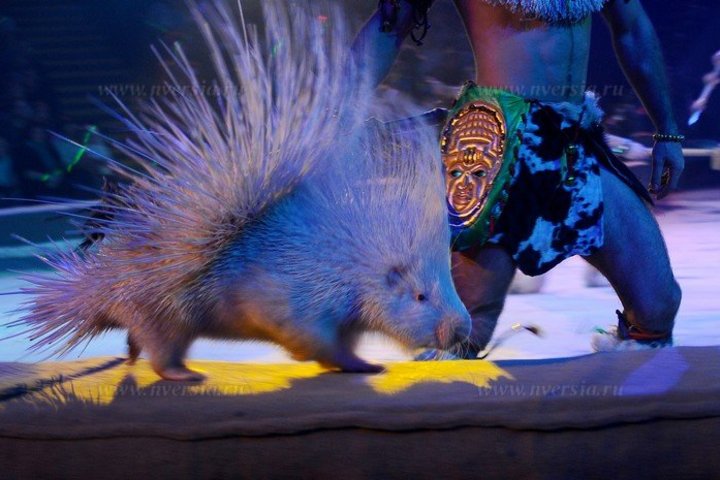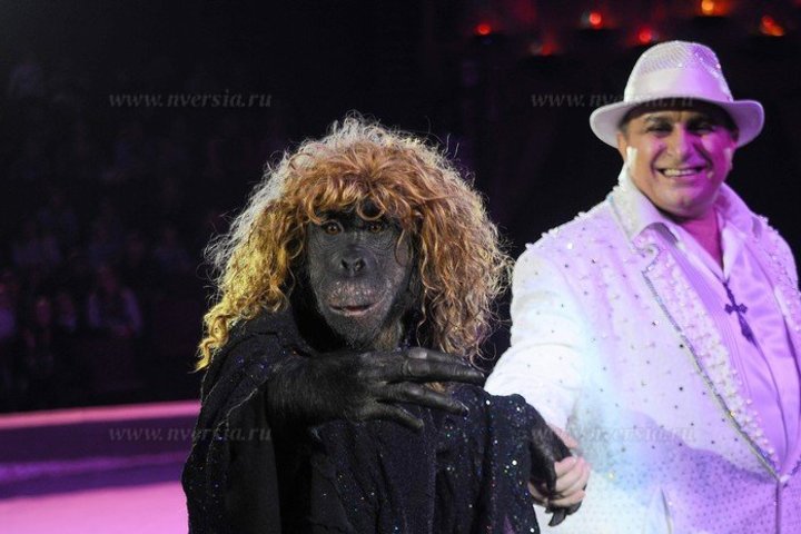 Специально для шоу в Саратов привезли более 70 животных: собак, крокодилов, змей, носух, дикобразов, лам, бегемота и обезьян. Последние выходят на манеж в различных образах - джигитов, русских барынь, балерины, Аллы Пугачевой и Максима Галкина, Верки Сердючки.