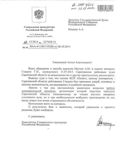 Заместитель генерального прокурора РФ Сабир Кехлеров ответил на запрос депутата Госдумы РФ Антона Ищенко об осужденном в Саратове за мошенничество и другие преступления Григории Гладуне. Об этом корреспонденту ИА "Версия-Саратов" рассказала Людмила Клобуцкая — супруга экс-председателя ЖСК "Полет", ныне отбывающего четырехлетний срок в колонии общего режима.