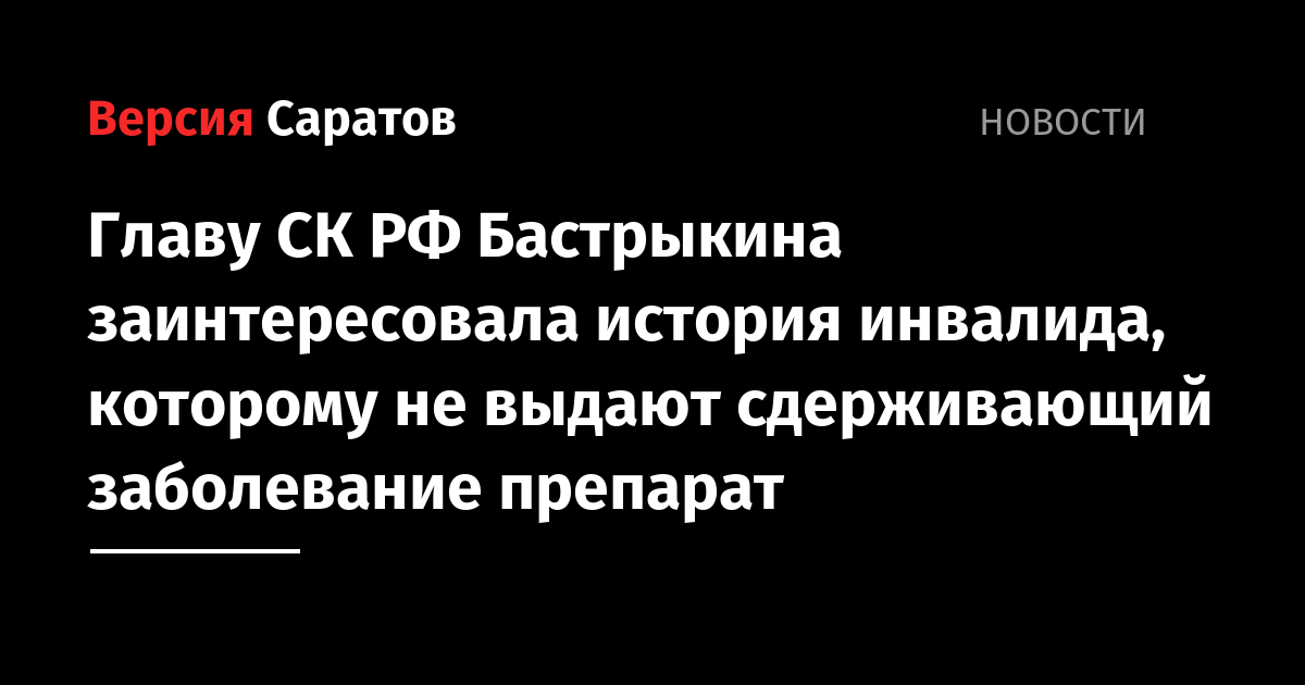 Глава СК РФ Александр Бастрыкин затребовал доклад по уголовному делу о ненадлежащем медицинском обеспечении инвалида в Саратовской области. Об этом сообщили в пресс-центре федерального ведомства.