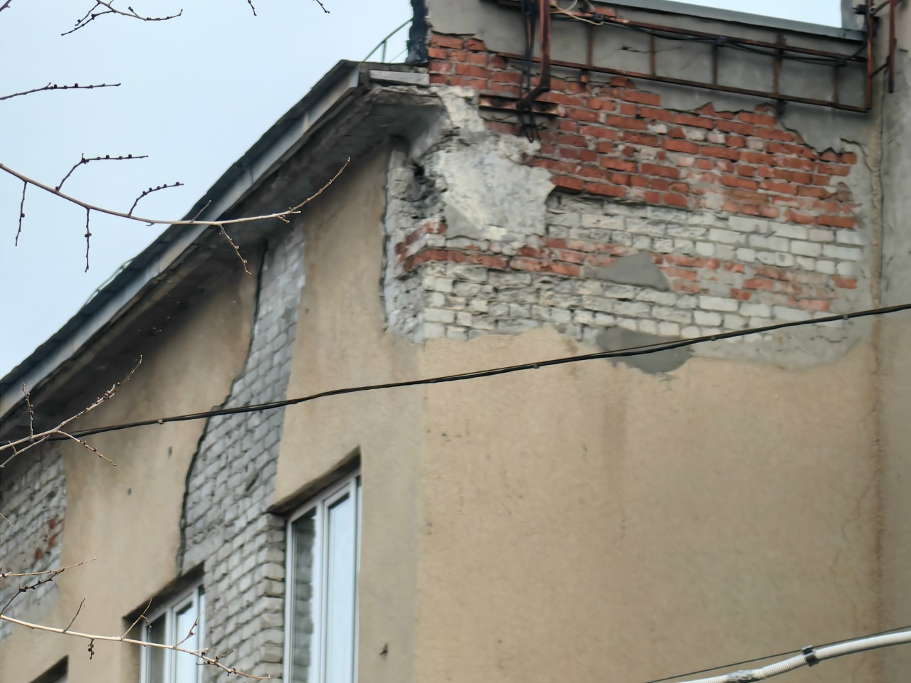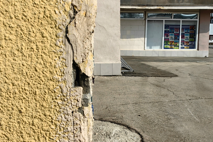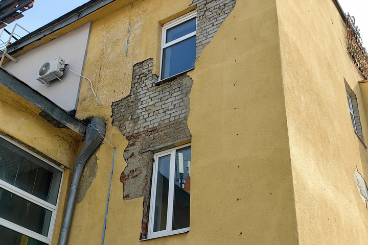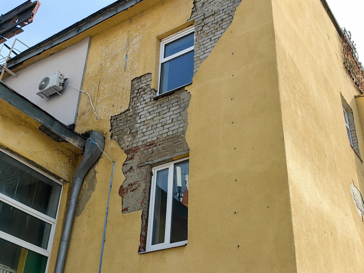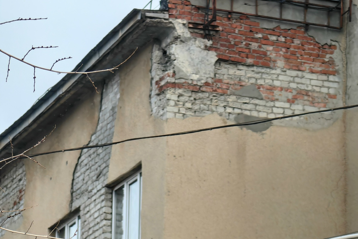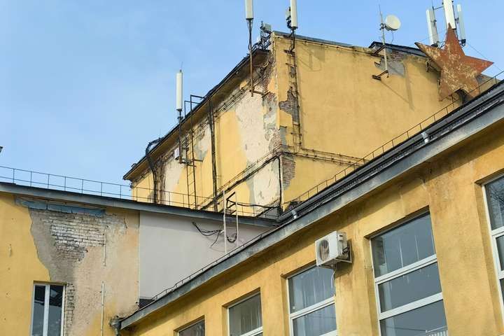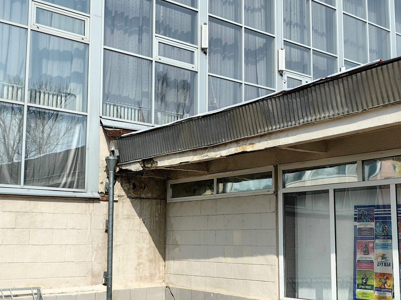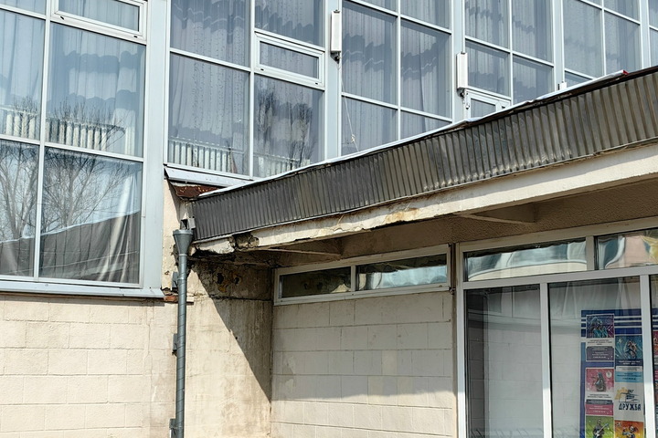 Интересно, что само здание центра народного творчества, в котором выступал глава региона, представляет собой печальное зрелище. Его стены снаружи и внутри имеют серьёзные повреждения. Также как и потолок в актовом зале.