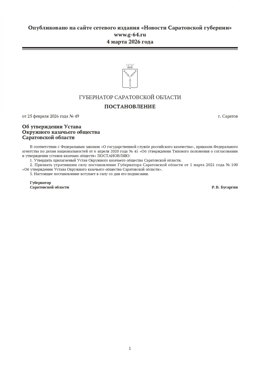 Губернатор Роман Бусаргин подписал постановление об утверждении устава Окружного казачьего общества Саратовской области. Оно было создано путем объединения 21 казачьего общества, которые находятся на территории региона.