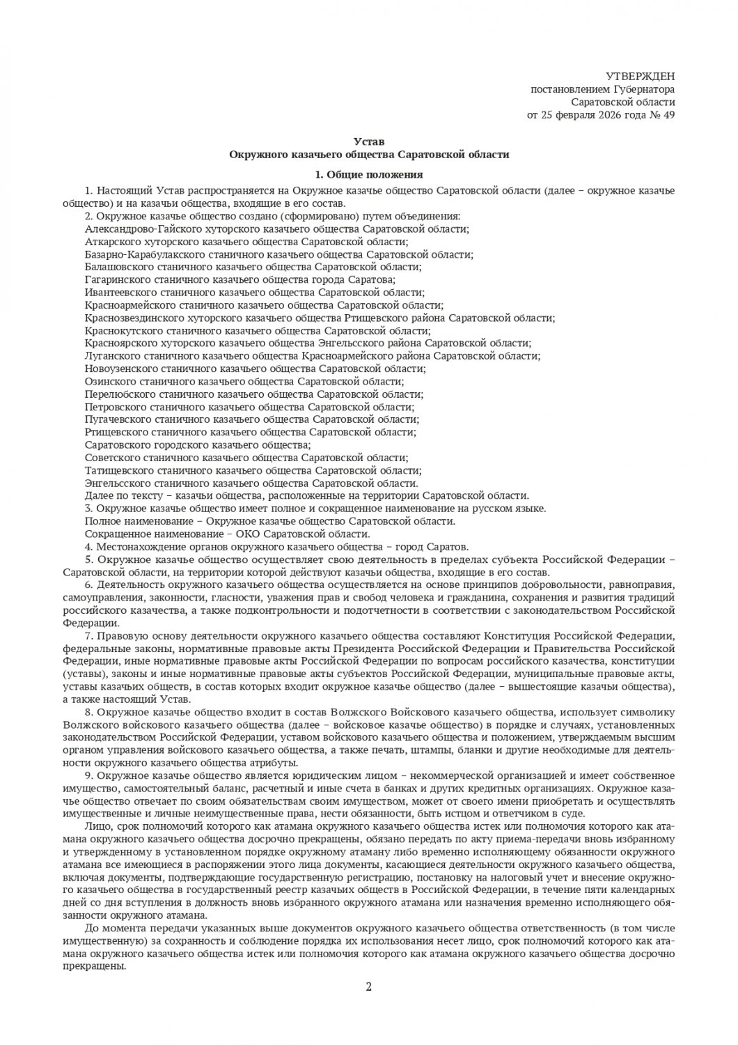 Губернатор утвердил устав Окружного казачьего общества Саратовской области