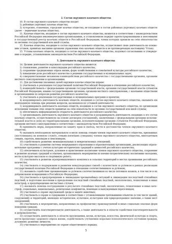 Окружное казачье общество является юридическим лицом — некоммерческой организацией и имеет собственное имущество, самостоятельный баланс, расчетный и иные счета в банках и других кредитных организациях. В документе уточняется, что целями его деятельности является становление, развитие и консолидация российского казачества, сохранение традиционных образа жизни, самобытной культуры казачества, повышение его роли в решении государственных и муниципальных задач.