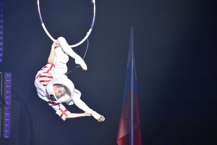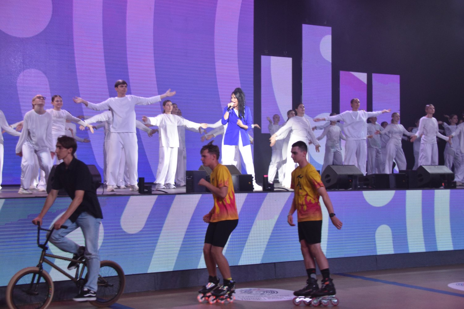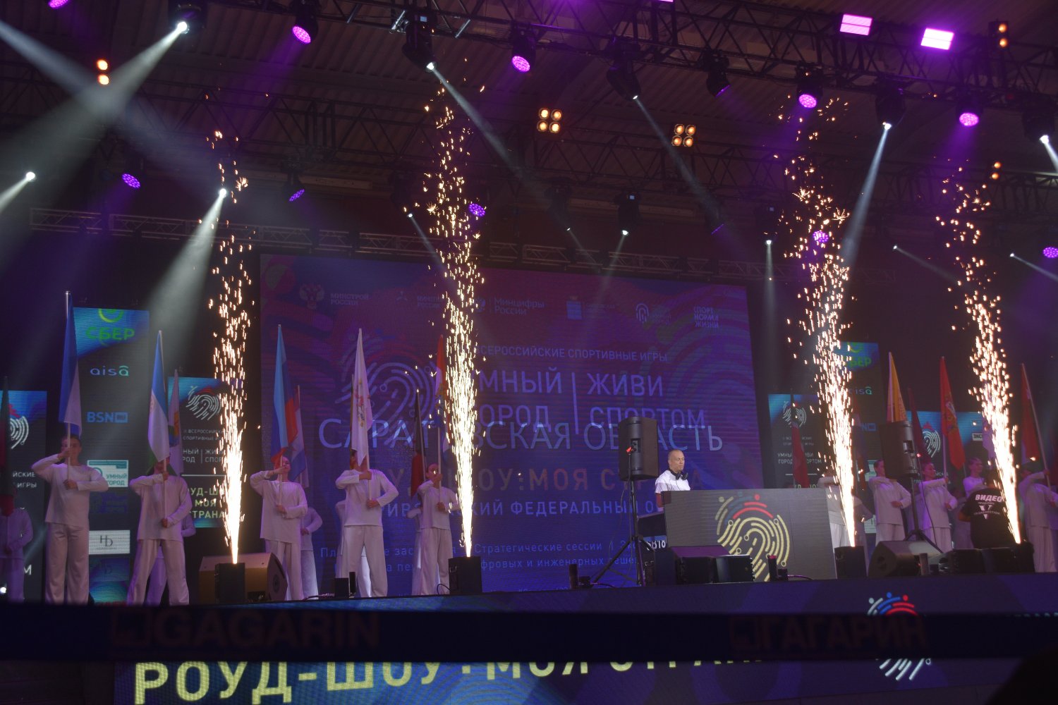 Церемония стартовала с поднятия флага, который внесли именитые саратовские спортсмены. Открыли шоу мотоциклисты с пиротехникой. Далее зрителям были представлены различные номера. В зале выступили гимнастки в костюмах космонавтов, пока на фоне играл симфонический оркестр. Номер был посещен полету Юрия Гагарина. Девушка в очках дополненной реальности в реальном времени нарисовала 3-D картину с лучшими видами Саратова. Ее работу проецировали на главный экран, пока на сцене шел музыкальный номер.
