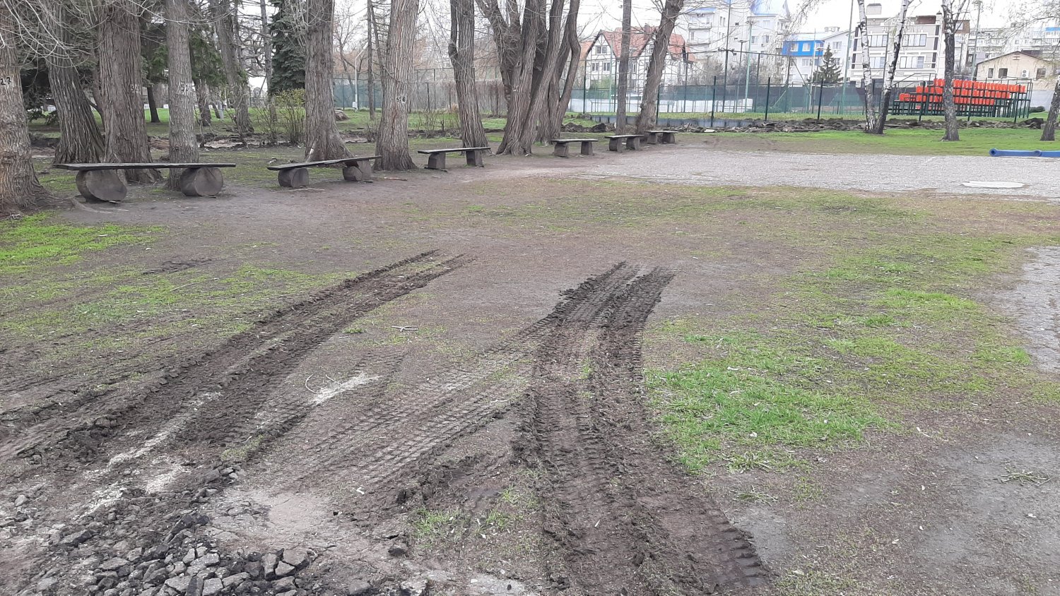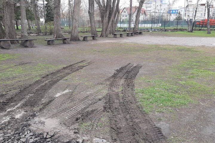 Так, корреспондент нашего издания зафиксировал следы тяжёлой техники, которая перемещалась прямо по газонам, отмеченным на карте функционального зонирования Горпарка как зона особо охраняемых природных территорий. Здесь, по словам специалистов, нельзя вбивать даже колышки, не то, что ездить колёсами грузовиков и экскаваторов.