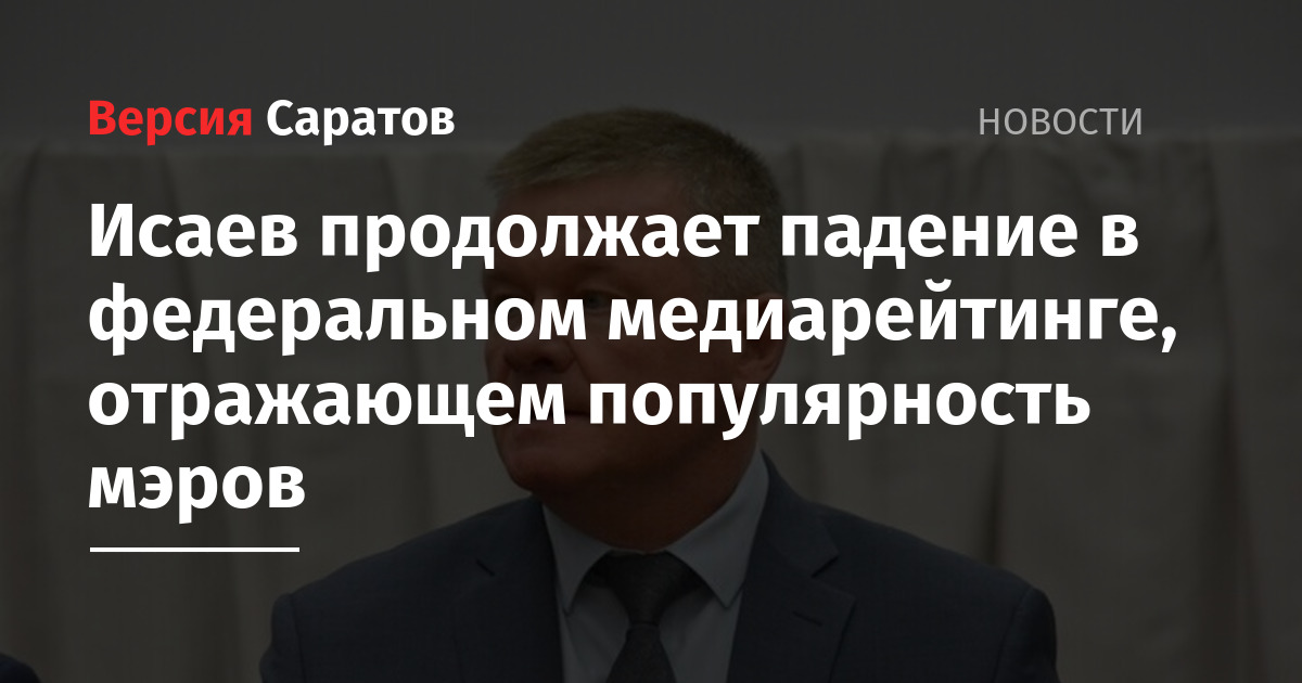 Глава Саратова Михаил Исаев продолжает падение в медиарейтинге глав столиц субъектов Приволжского федерального округа. Рейтинг, отражающий популярность чиновников, подготовила компания «Медиалогия».