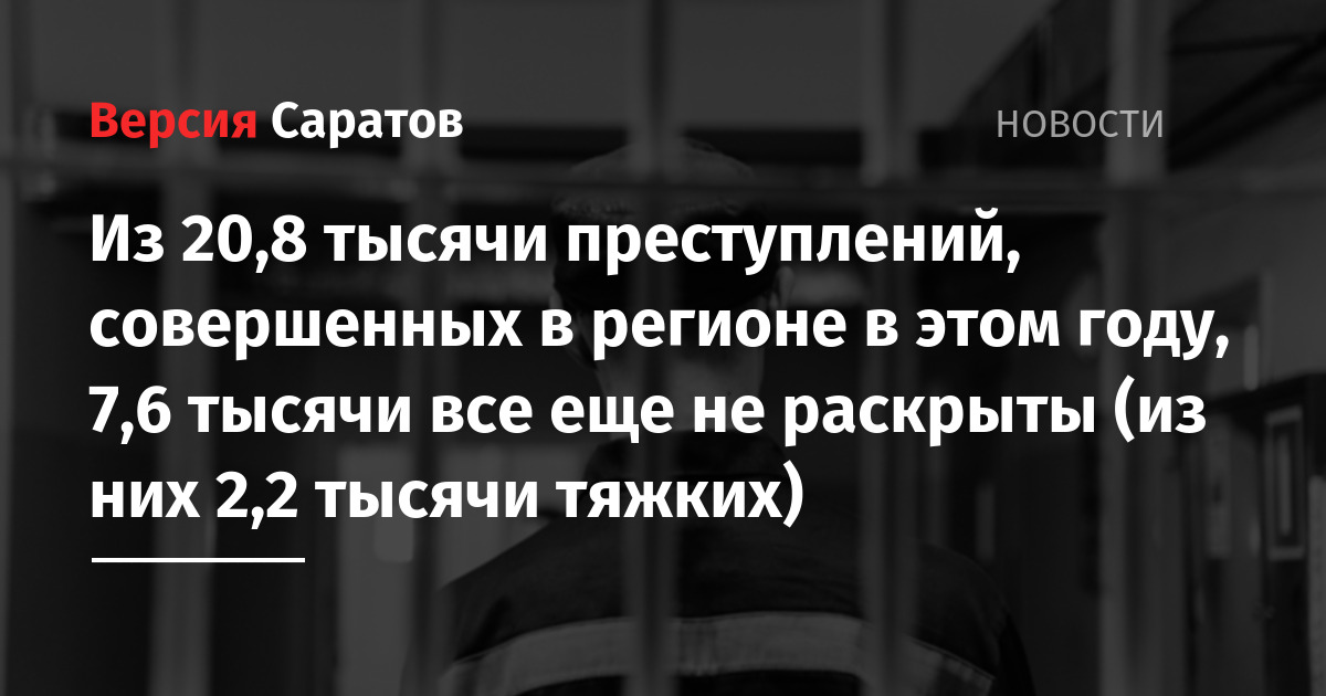 Что касается тяжких преступлений, в области их совершено 6 тысяч. Рост составил 6,4%. Стоит отметить, что в Приволжском федеральном округе их количество снизилось на 0,7%. Саратовская область оказалась на 4-м месте в Поволжье по росту тяжких преступлений. До сих пор не раскрыто 2,2 тысячи тяжких преступлений в регионе. Это на 8,4% больше, чем в предыдущем периоде.