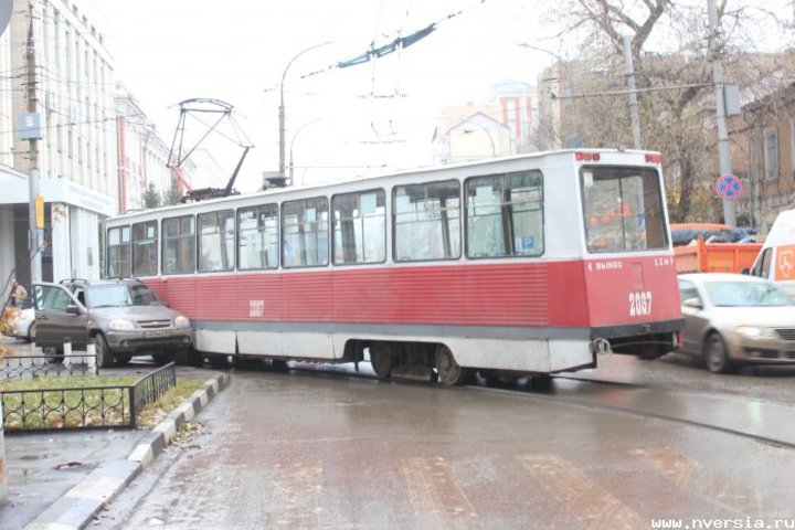 В центре Саратова, в Мирном переулке произошло ДТП с участием трамвая. Он на повороте "притер" выезжающую с улицы Советской в сторону театра драмы Chevrolet Niva. "Нива" при этом оказалась двумя колесами на тротуаре. Водитель трамвая рассказала ИА "Версия-Саратов", что легковушка так пыталась "разойтись" со встречным транспортом. "Он туда въехал, когда уже видел, что столкновения ему не избежать. Ждем, как ГАИ приедет. Может, час, может, меньше. Стоят четыре маршрута: №№ 3, 9, 10, 11. Как только ГАИ нас отпускает, мы разъезжаемся. Здесь его вина будет. Там знак висит. Я поворачиваю с главной дороги на главную. Ну, его предупредили: мало того, что заплатит штраф, еще оплатит простой", - заявила она.