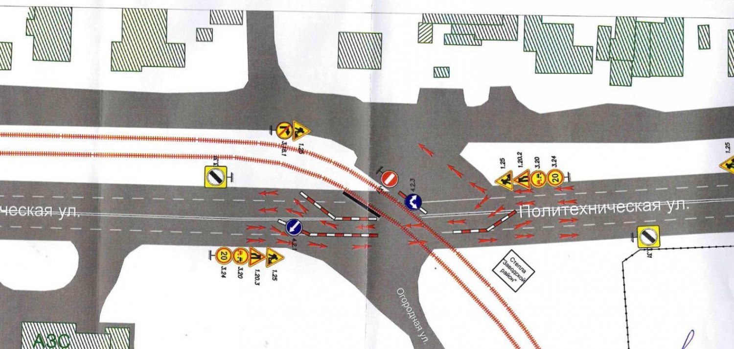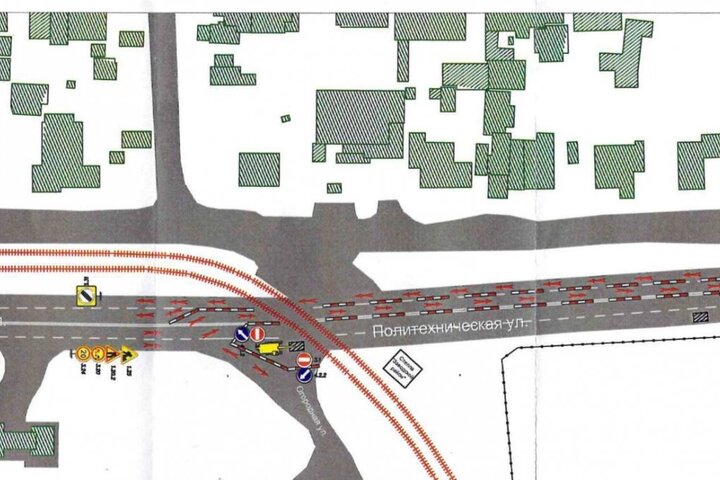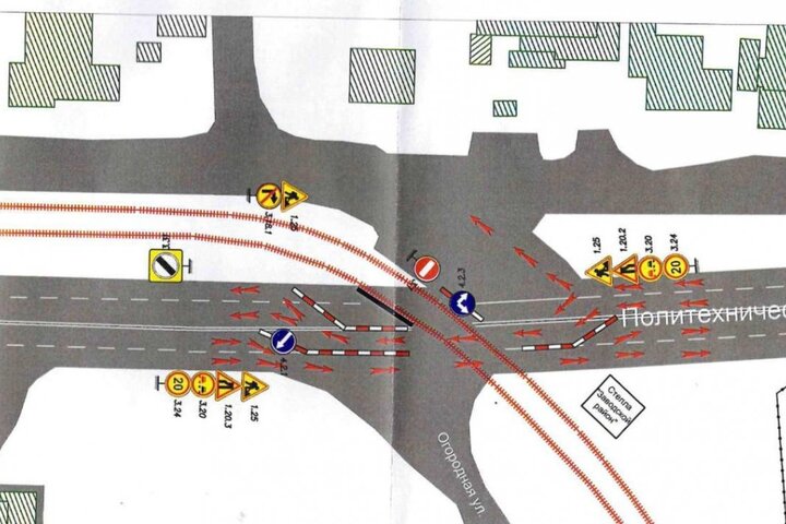 Ограничения будут на пересечении улиц Политехническая и Огородная. Работы планируется проводить в два этапа: