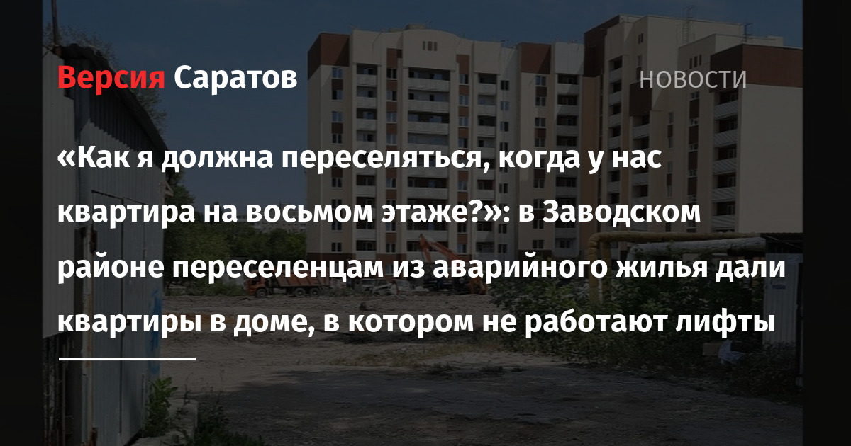 В Заводском районе Саратова (глава — Вячеслав Доронин) переселенцев из аварийного жилья переселили в дом, в котором не работают лифты. Об этом ИА «Версия-Саратов» рассказала читательница Екатерина.