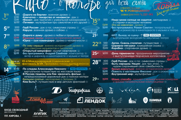 В ноябре в саратовском кинотеатре «Победа», который принадлежит государству, продолжатся бесплатные кинопоказы. Средне-волжский филиал ФГБУК АУИПИК, в оперативном управлении которого находится памятник, поделился с ИА «Версия-Саратов» афишей.