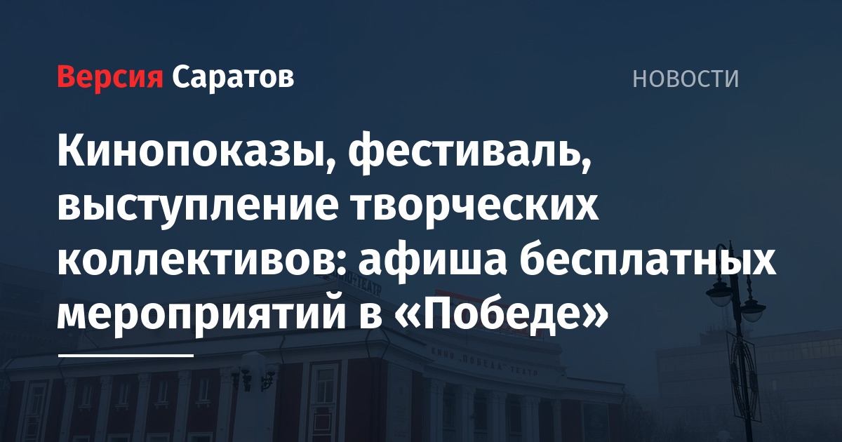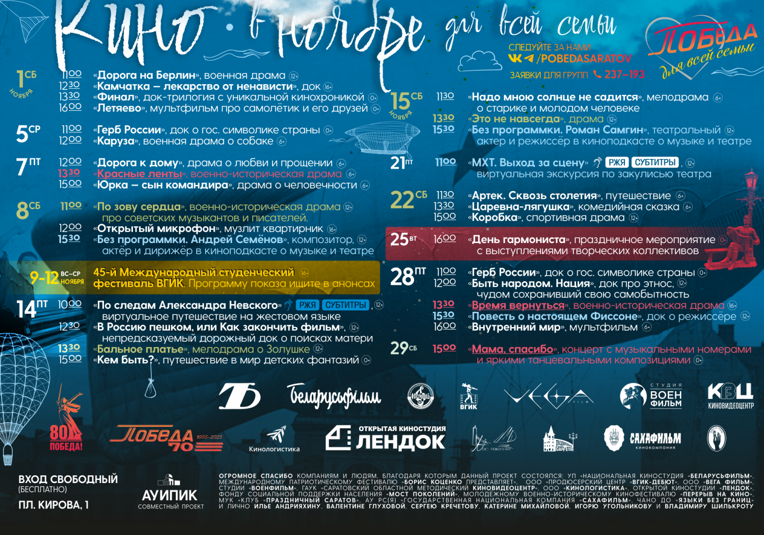 В ноябре в саратовском кинотеатре «Победа», который принадлежит государству, продолжатся бесплатные кинопоказы. Средне-волжский филиал ФГБУК АУИПИК, в оперативном управлении которого находится памятник, поделился с ИА «Версия-Саратов» афишей.