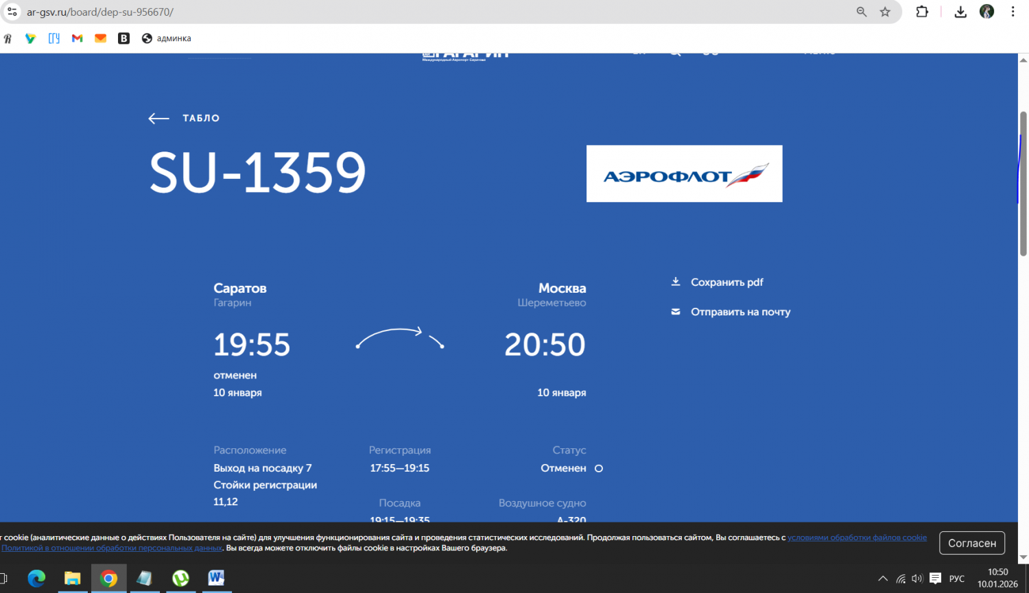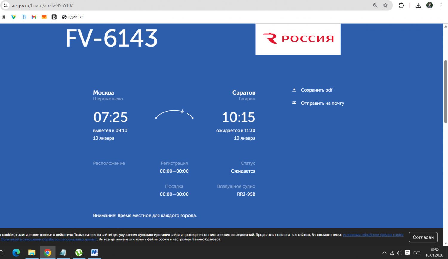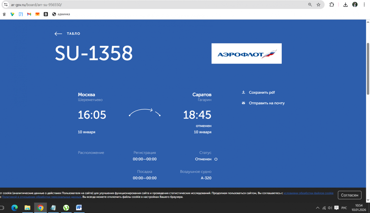 Один саратовский рейс в «Шереметьево» сдвинули с 23:45 9 января на 10:30 10 января, другой — с 11:05 на 12:00, третий — с 10:15 на 13:55. Вчерашний рейс в «Шереметьево», запланированный на 19:55, отменили.
