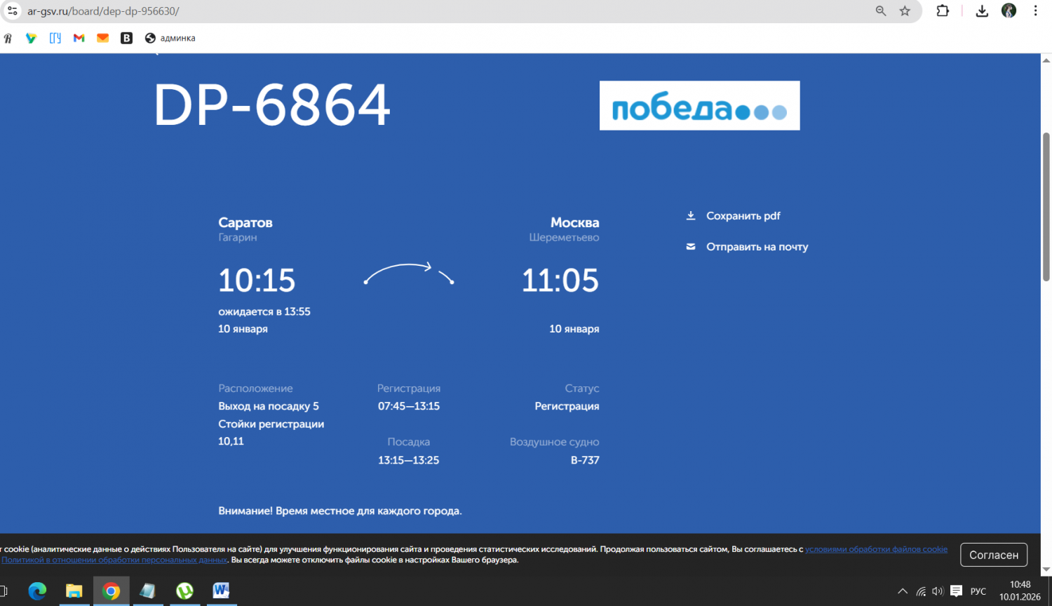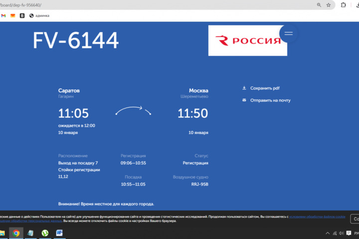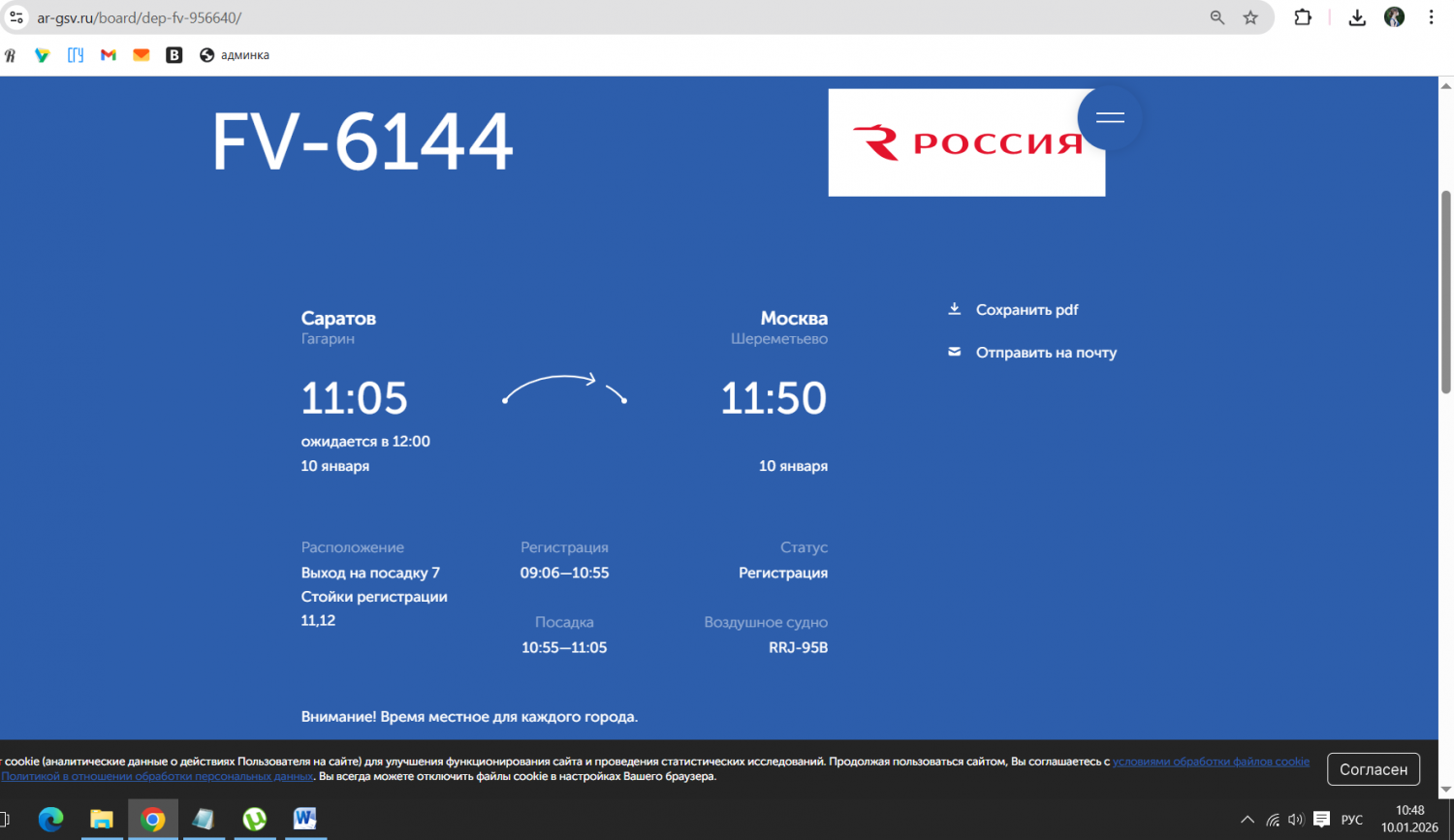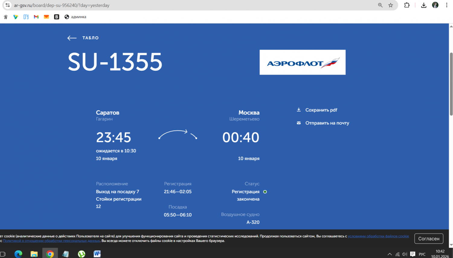 Один саратовский рейс в «Шереметьево» сдвинули с 23:45 9 января на 10:30 10 января, другой — с 11:05 на 12:00, третий — с 10:15 на 13:55. Вчерашний рейс в «Шереметьево», запланированный на 19:55, отменили.