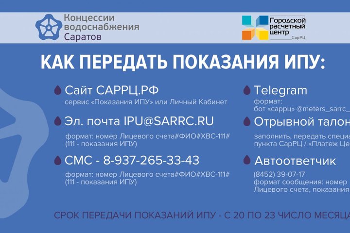 ООО «Концессии водоснабжения — Саратов» напоминает, что передача показаний счетчиков производится с 20 по 23 число каждого месяца. Для повышения качества обслуживания потребителей абонентам доступны удобные сервисы передачи показаний. Данные о потребленных коммунальных услугах можно предоставить дистанционно: