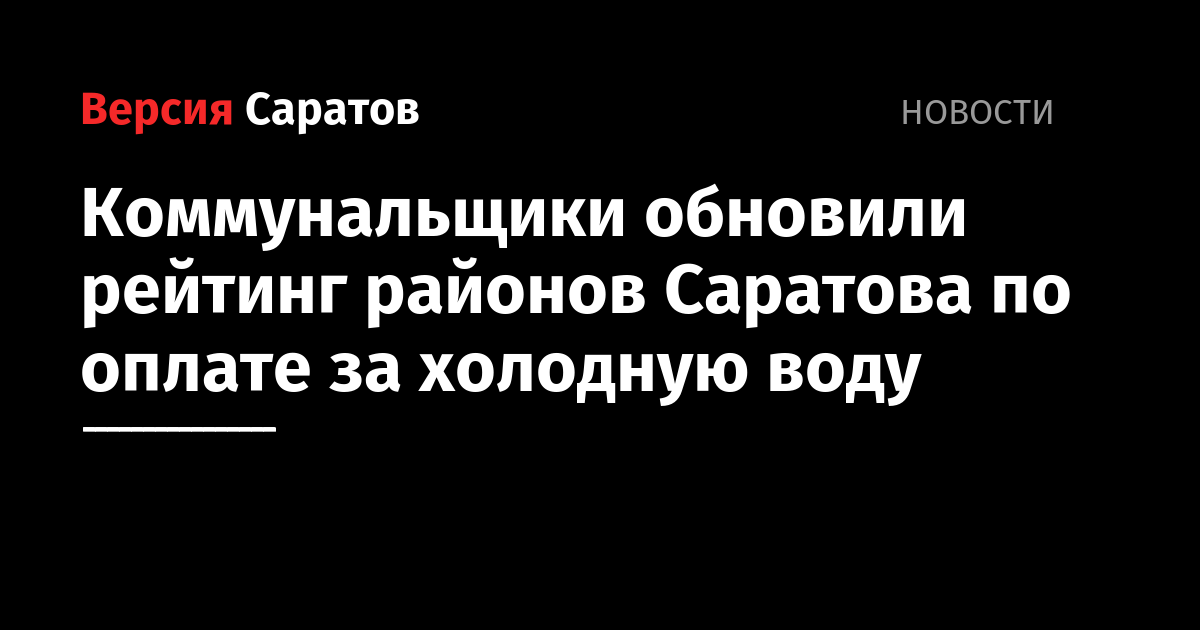 ООО «Концессии водоснабжения — Саратов» обновлен рейтинг районов города по оплате услуг водоснабжения и водоотведения. При составлении рейтинга учитывалась история погашения платежей, процент собираемости и задолженность управляющих организаций, ТСЖ и ЖСК. Места в рейтинге определены пропорционально количеству управляющих жилым фондом компаний, обслуживающих дома на территории каждого конкретного района.