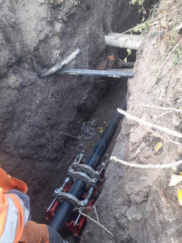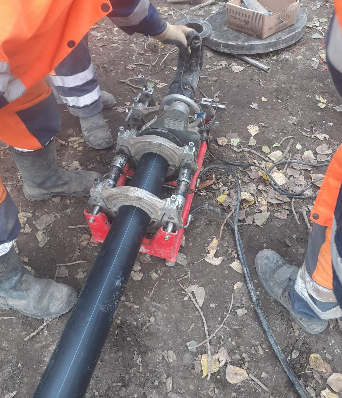 Прокладка сетей осуществляется методом горизонтального направленного бурения, позволяющим максимально сохранить благоустройство территории и избежать проведения масштабных земляных работ. Специалисты протягивают новые трубопроводы через два котлована с помощью специальных буровых установок.