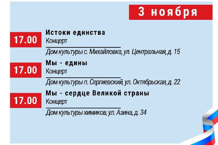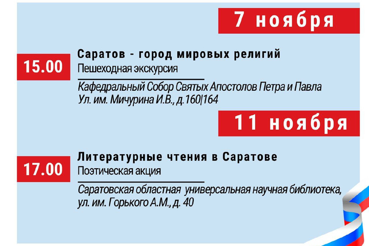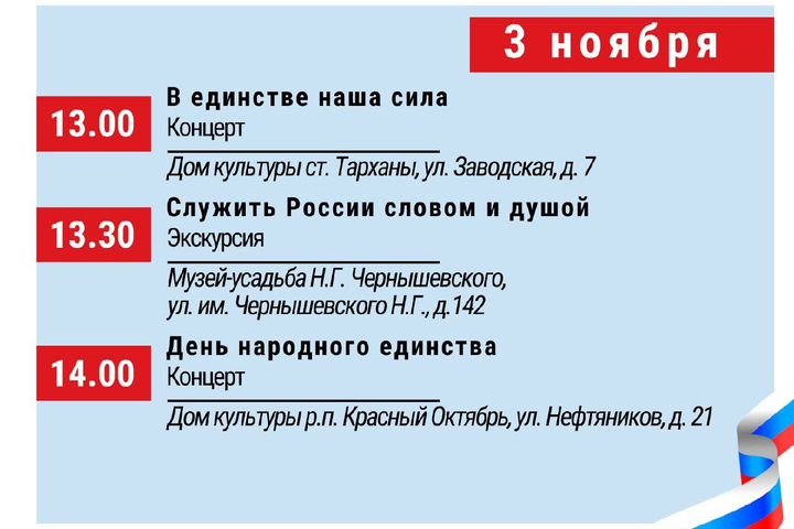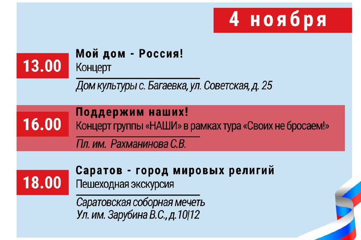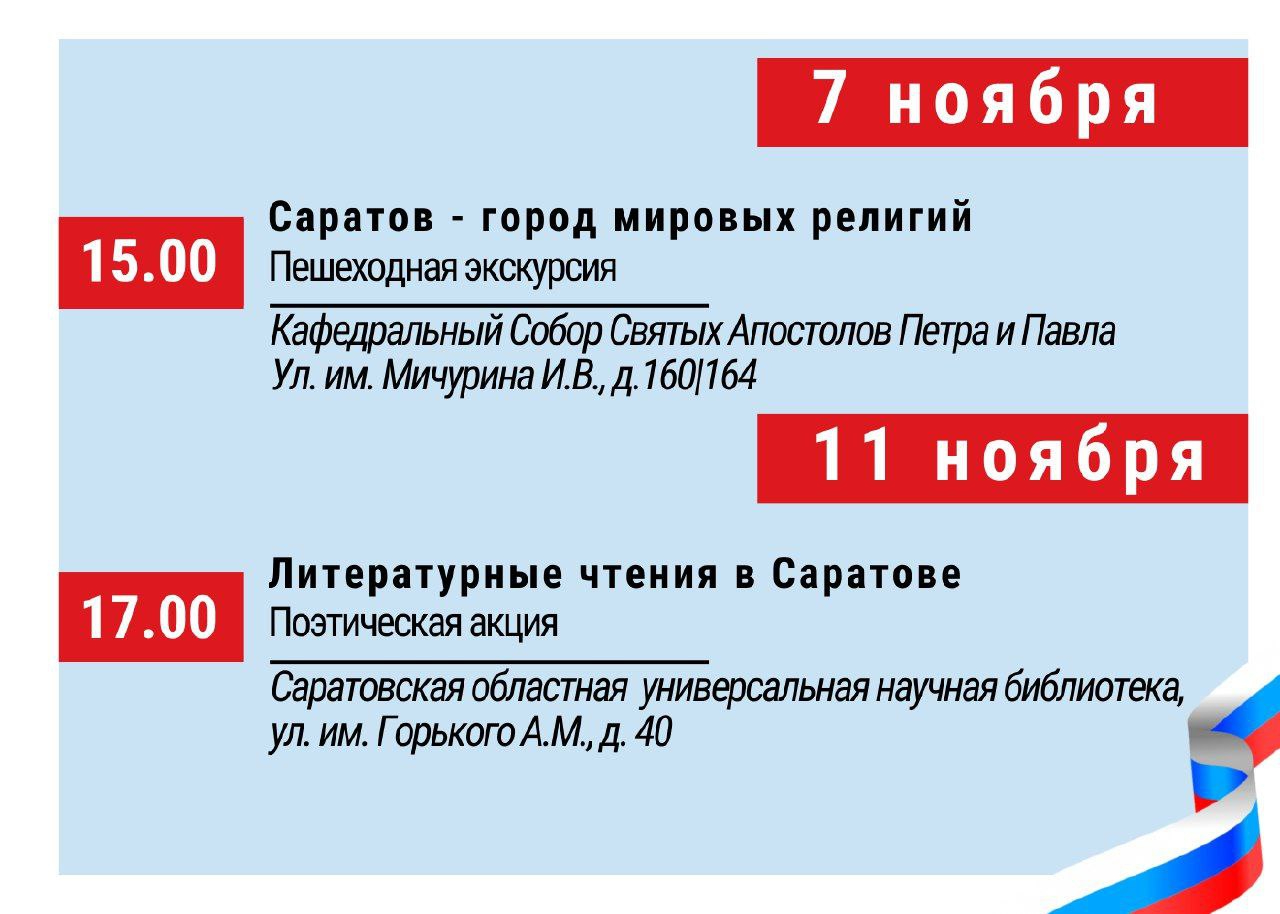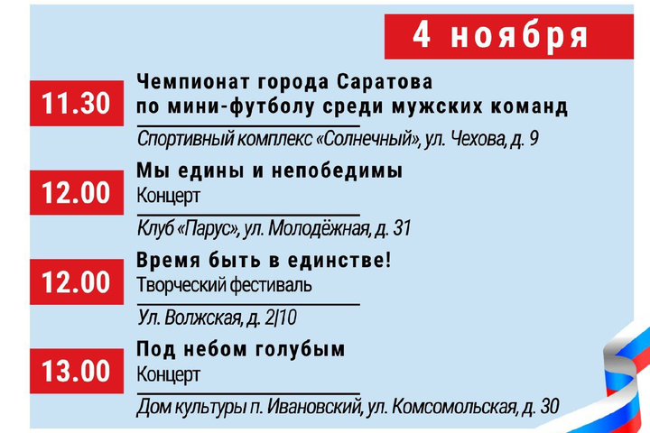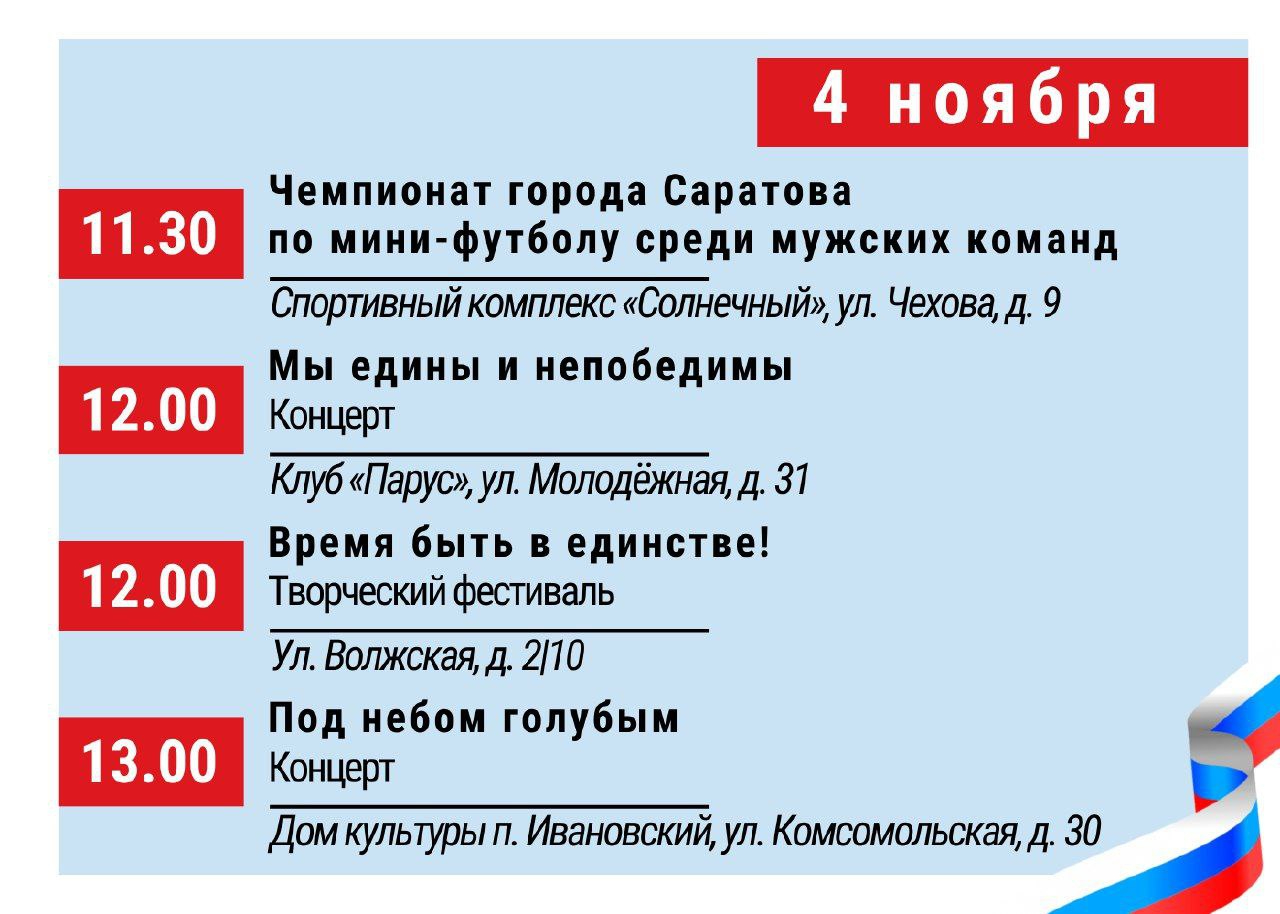 4 ноября в 11:30 в спорткомплексе «Солнечный» состоится чемпионат города по мини-футболу среди мужских команд. В 13:00 на Волжской начнётся творческий фестиваль «Время быть в единстве!». В 16:00 на площади имени Рахманинова пройдёт концерт группы «Наши». На 18:00 запланирована пешеходная экскурсия, которая начнётся у саратовской соборной мечети на Зарубина.