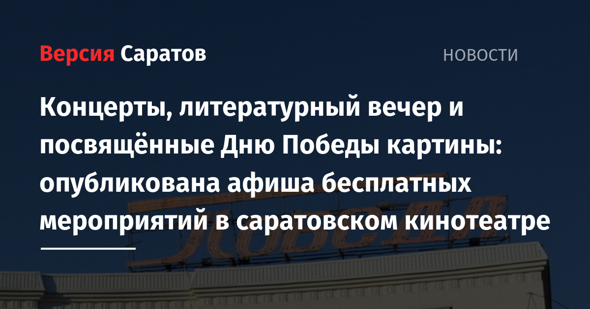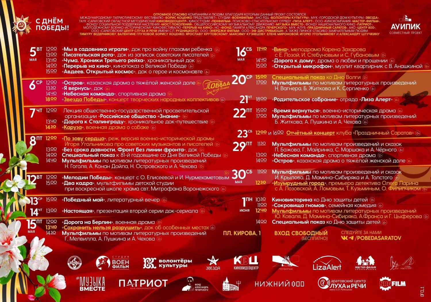 В мае в саратовском кинотеатре «Победа», который принадлежит государству, продолжатся бесплатные кинопоказы. Средне-волжский филиал ФГБУК АУИПИК, в оперативном управлении которого находится памятник, опубликовал афишу в соцсети «ВКонтакте».