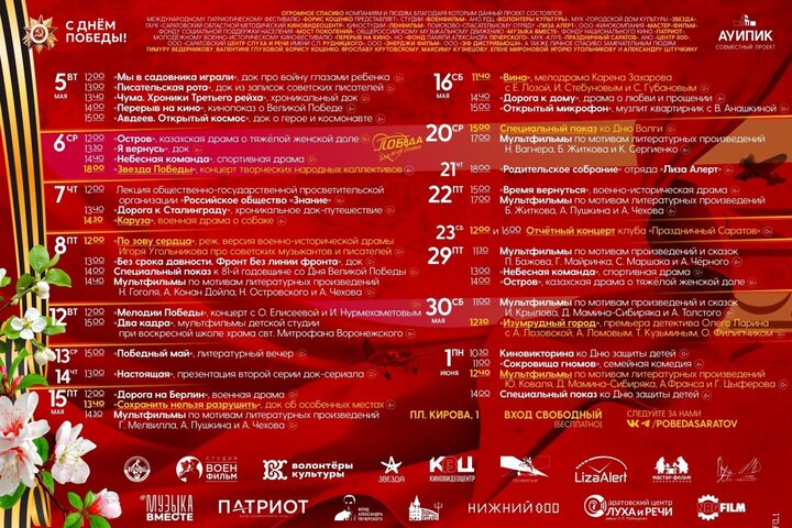Многие картины в следующем месяце будут посвящены Дню Победы. Подробнее с афишей можно ознакомиться в карточке, прикреплённой ниже.