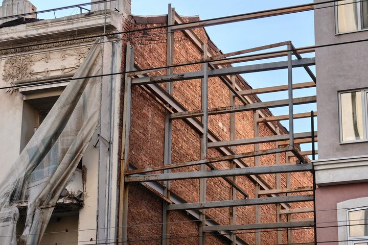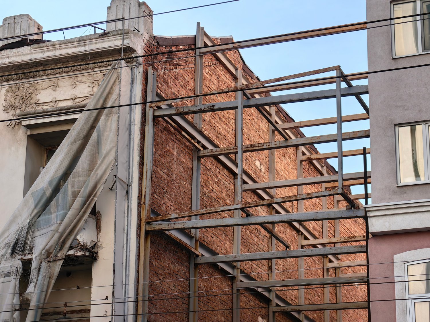 Единственная внушающая доверие опора для Дома Яхимовича — это железные балки, которые подпирают одну из стен и закреплены на соседней новостройке.