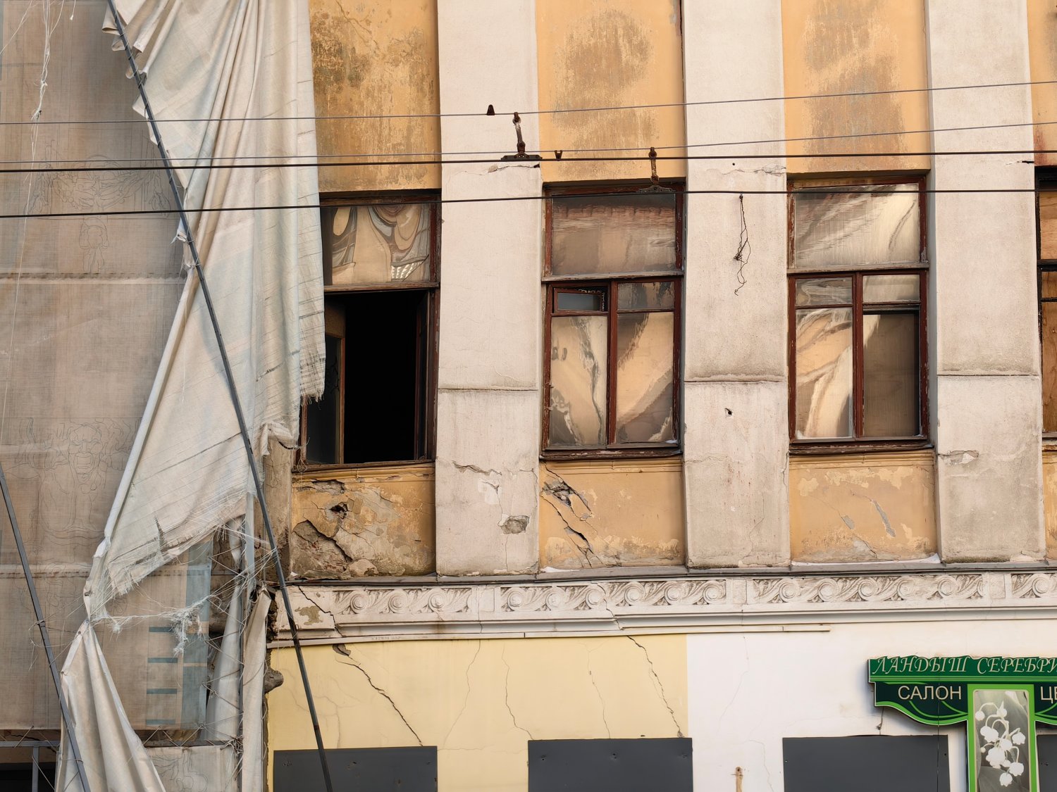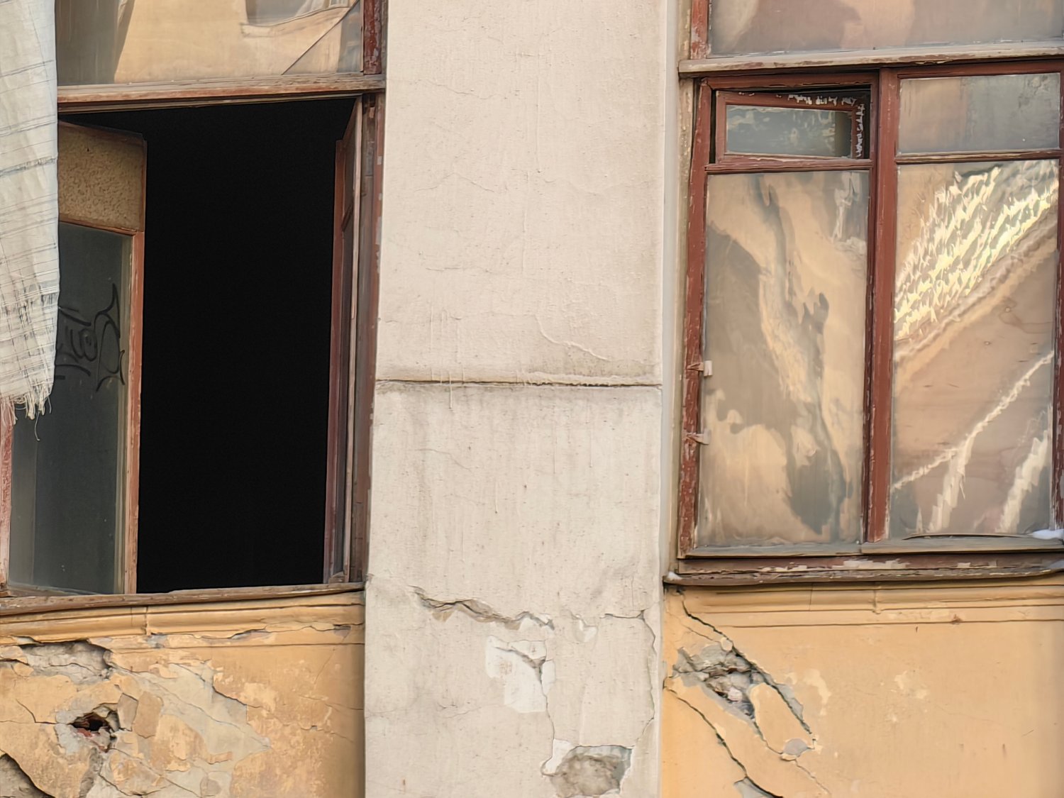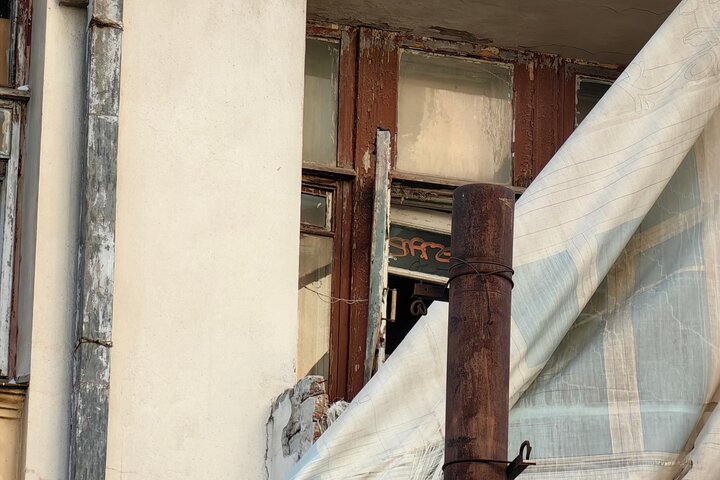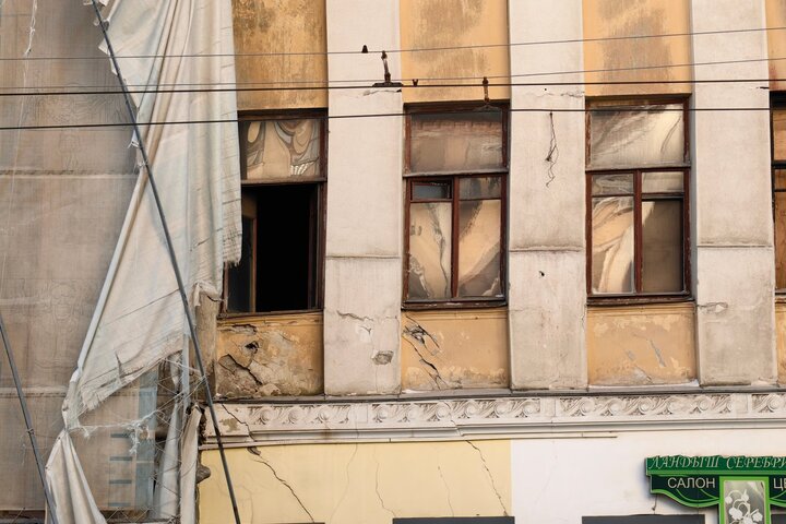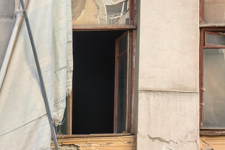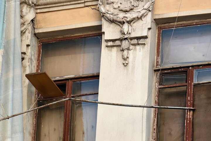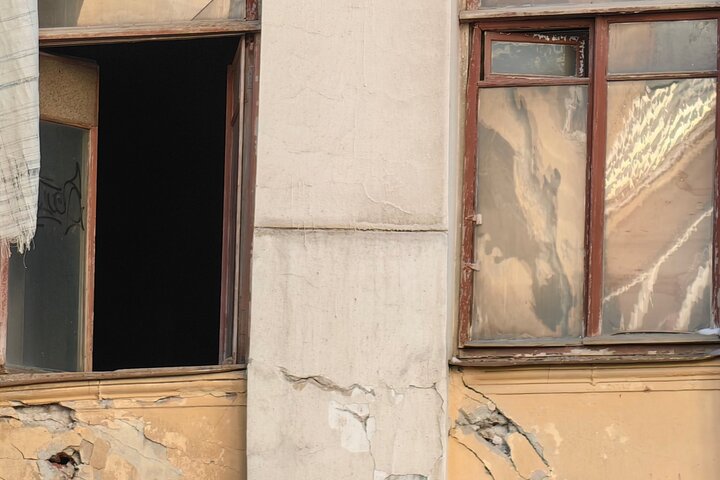 Один из балконов там полностью разрушен, а выход к нему, как и несколько окон, заколочены деревянными досками сомнительной надёжности. Часть окон распахнуты настежь (и этом при том, что на улице зима). Рамы давно покосились, а фасад здания усеян глубокими трещинами.