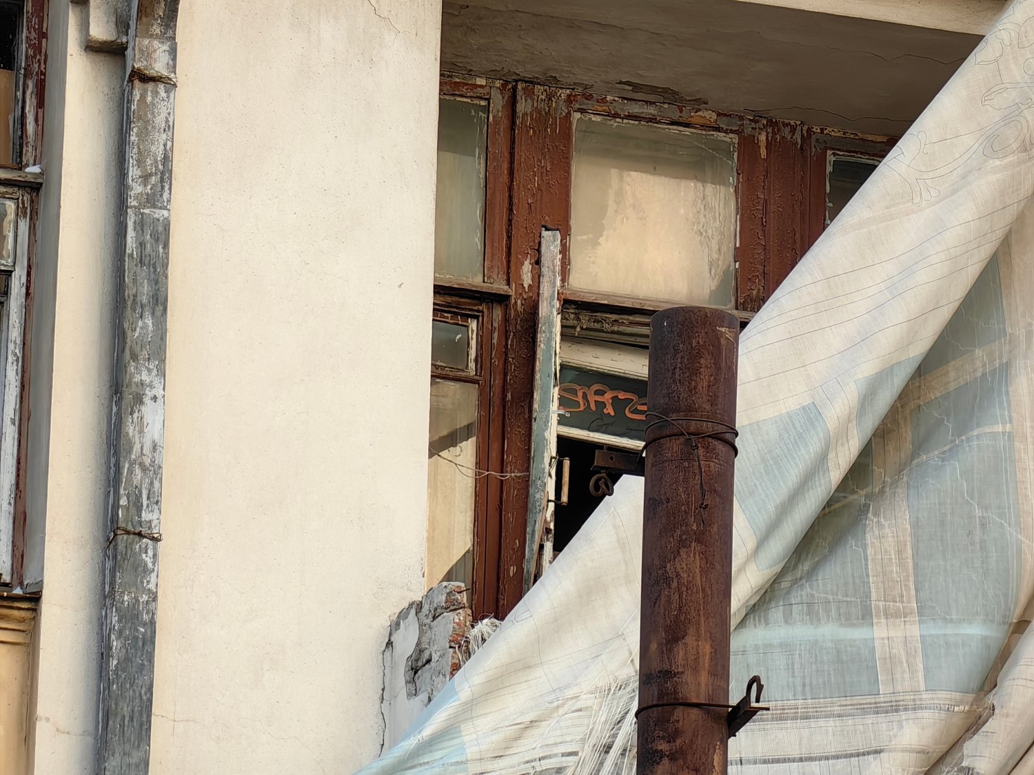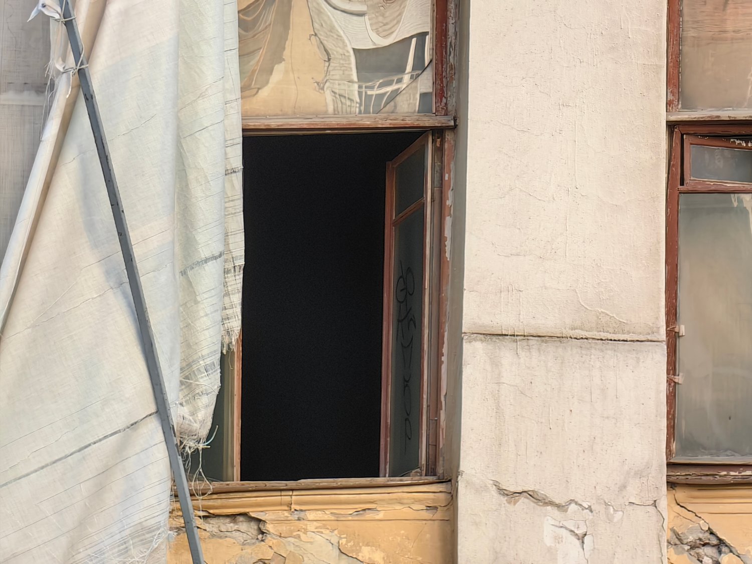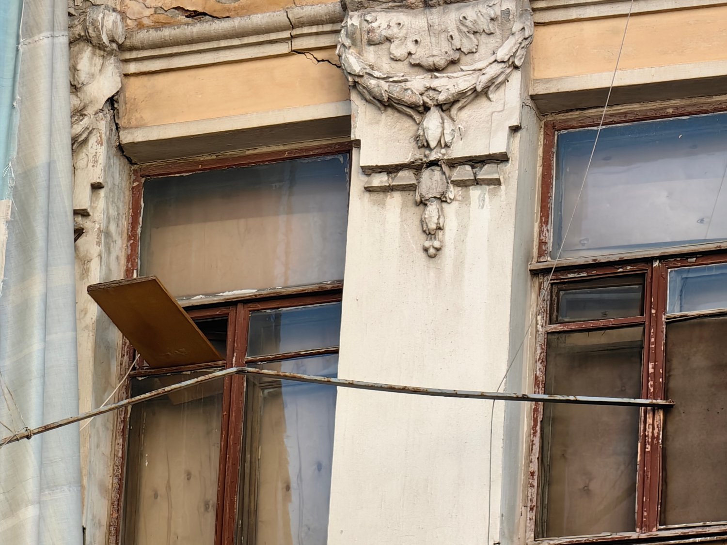 Один из балконов там полностью разрушен, а выход к нему, как и несколько окон, заколочены деревянными досками сомнительной надёжности. Часть окон распахнуты настежь (и этом при том, что на улице зима). Рамы давно покосились, а фасад здания усеян глубокими трещинами.