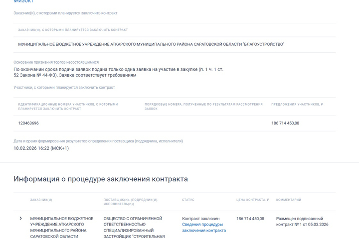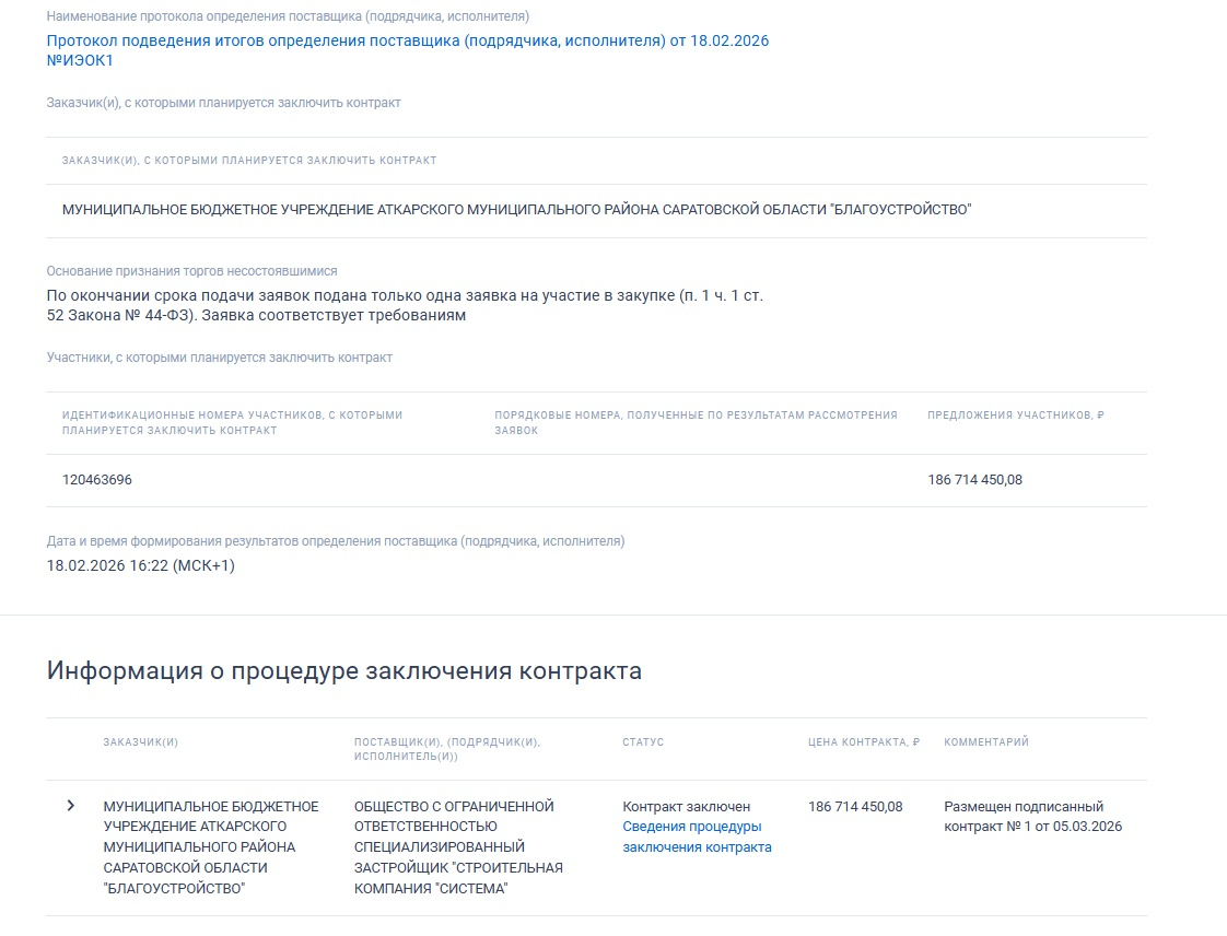 Единственным участником и победителем аукциона стало ООО Специализированный застройщик СК «Система» Дмитрия Дулепина. В прошлые годы эта компания построила много домов в Саратове и Энгельсе, в том числе в рамках программы переселения из аварийного жилья, а также социальные и спортивные объекты. Однако в последние годы число заключенных в регионе контрактов с «Системой» резко сократилось.